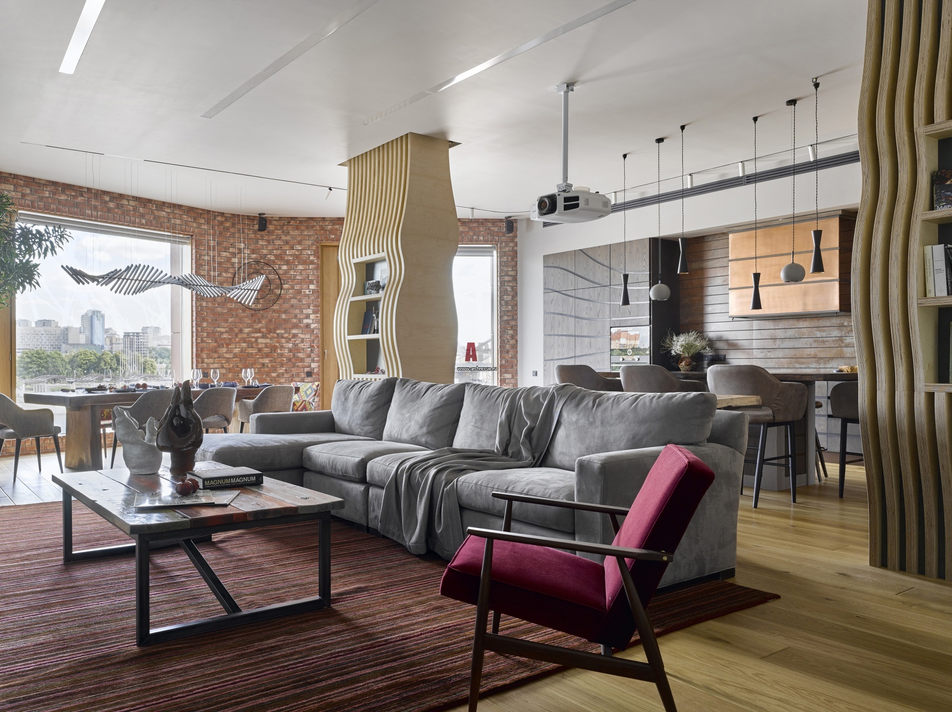 Главные визуальные доминанты общей зоны – стеллажи с параметрическими волнами, выполненные из обработанной лаком фанеры. Они появились из желания замаскировать несущие железобетонные колонны, но стали смысловым центром интерьера. Стены облицованы клинкерной плиткой. Вся мебель, кроме бордового кресла, сделана на заказ.