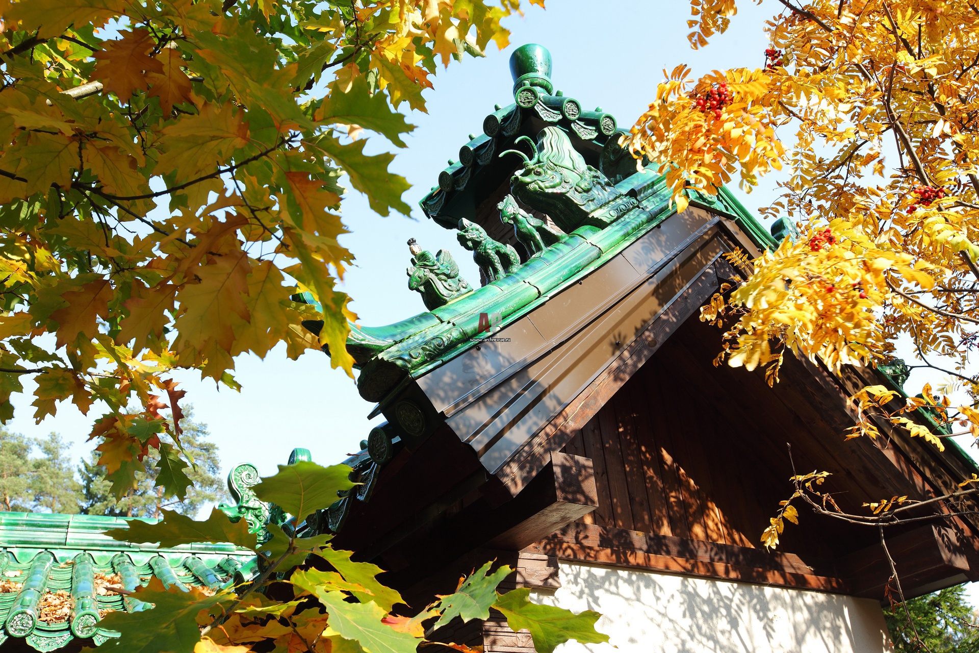 Крыша беседки выложена фигурной китайской черепицей со скульптурным изображением драконов. Она создана китайскими мастерами на заводе в Пекине.