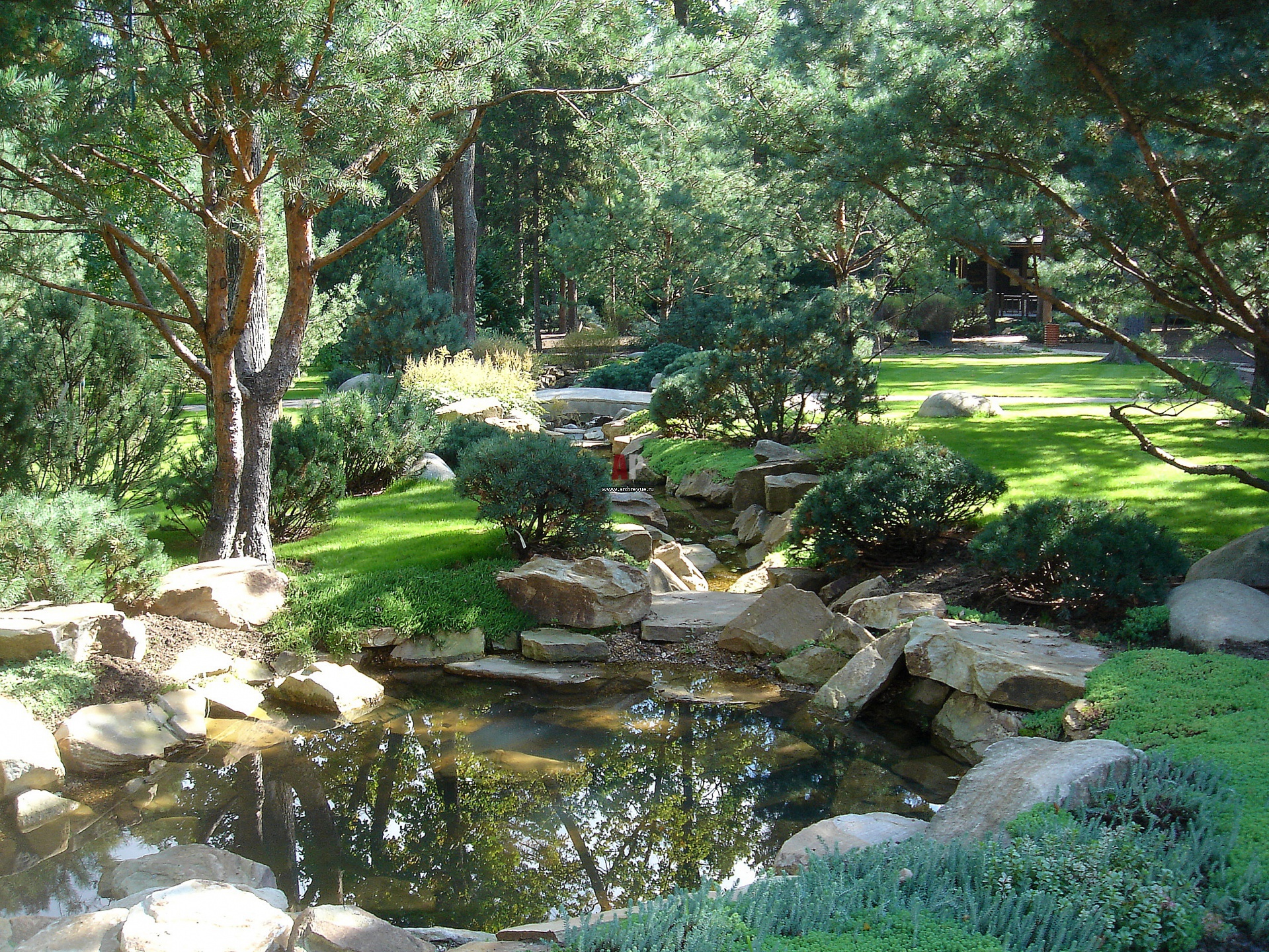 Ручей длиной более100 метров протекает через весь участок, местами образуя живописные водоемы. Его берега выложены булыжниками и засажены разными видами хвойных растений (горные сосны, можжевельники) и почвопокровными цветниками (очитки, мхи, камнеломки).