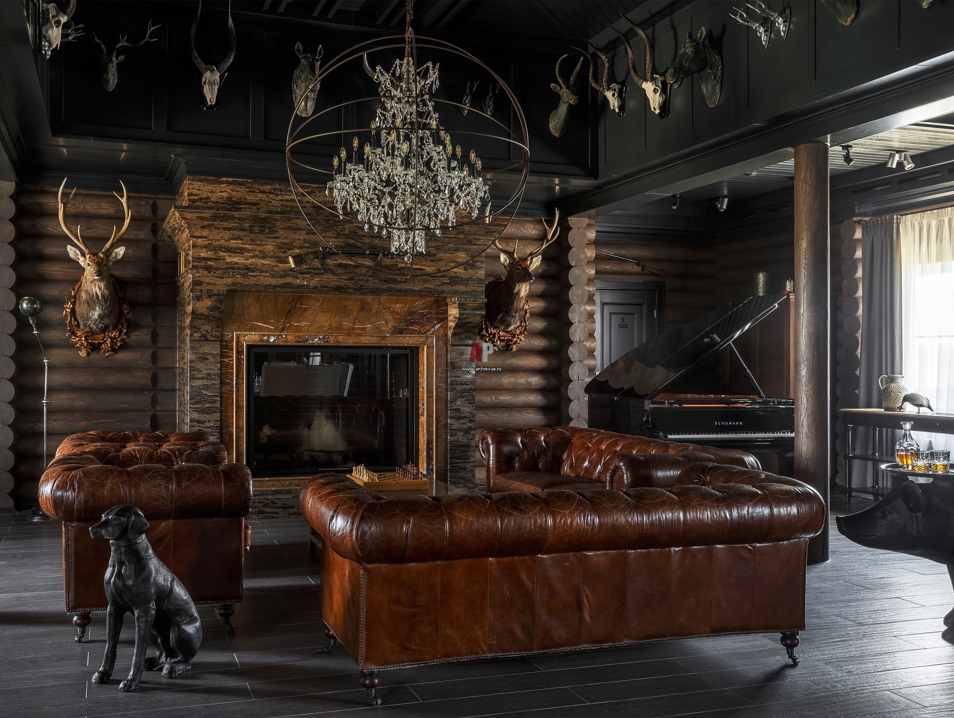 Отель «Уткино Country House». Интерьер гостиной президентского коттеджа. Портал камина сделан из бежевого мрамора. Черный рояль, Schumann.
