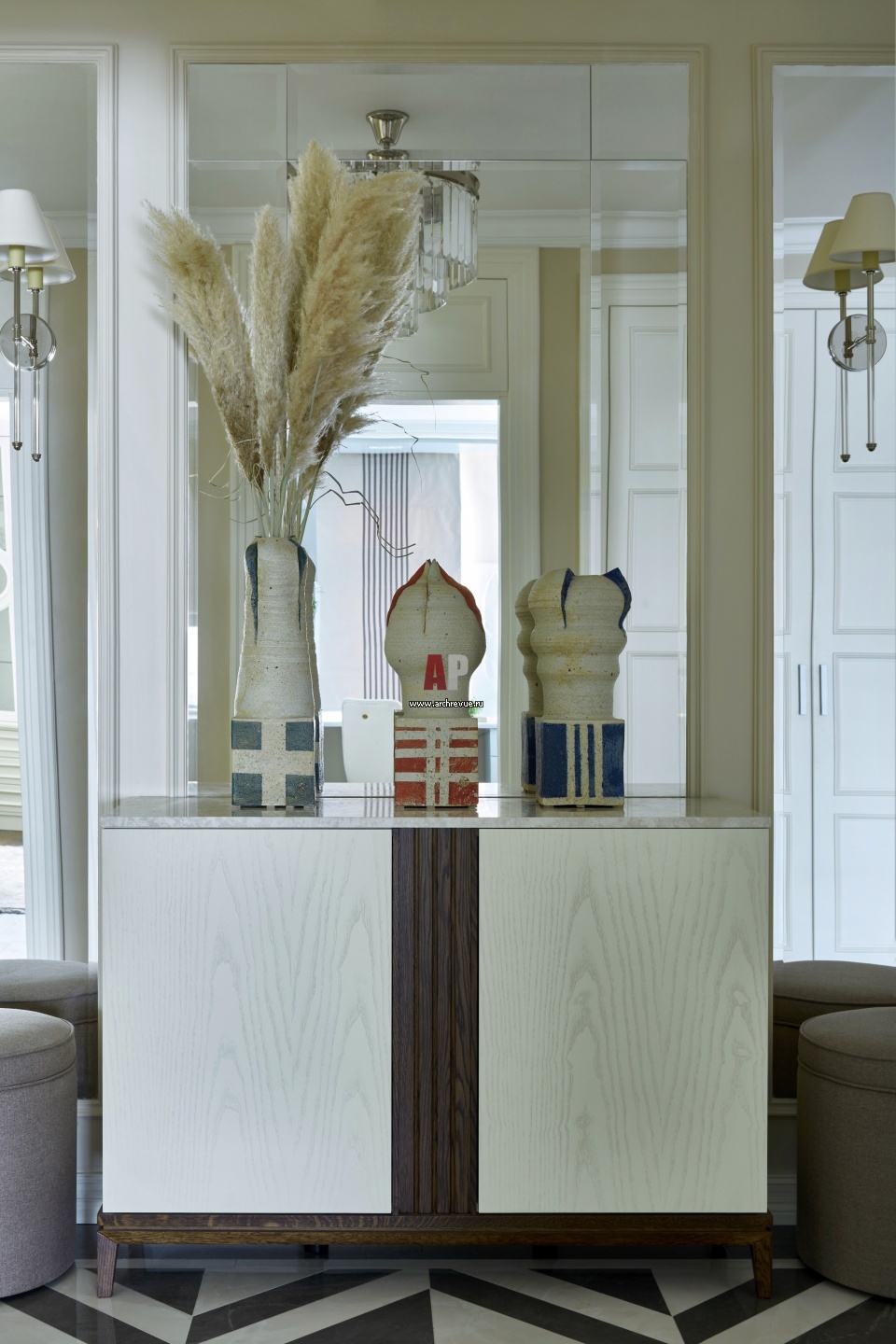Прихожая оформлена в стиле американских интерьеров. На полу – черно-белый керамогранит Atlas Concorde с геометричным рисунком. Его ритм повторяет оформление фасадов тумбы, сделанной на заказ. Столешница тумбы – мрамор. Бра, Visual Comfort & Co.
