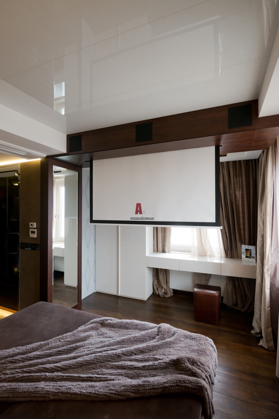 Жилые помещения квартиры насыщены разнообразными функциями, необходимыми для современного горожанина. В спальне помимо зоны отдыха, будуара и гардеробной спроектирована система домашнего кинотеатра с выдвижным экраном.