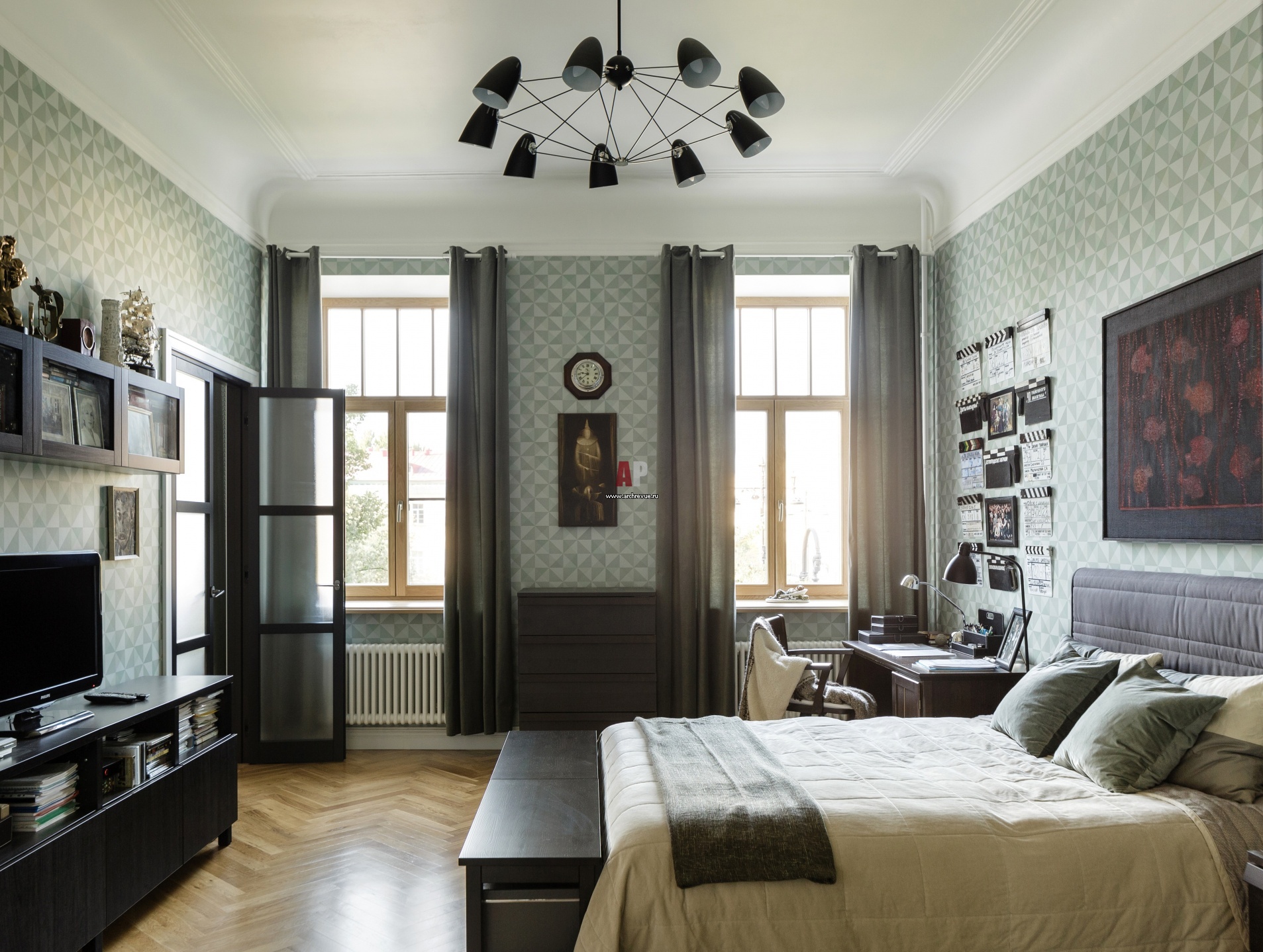 Мужская спальня выдержана в прохладных бирюзовых тонах. Лепные потолочные карнизы – исторические.