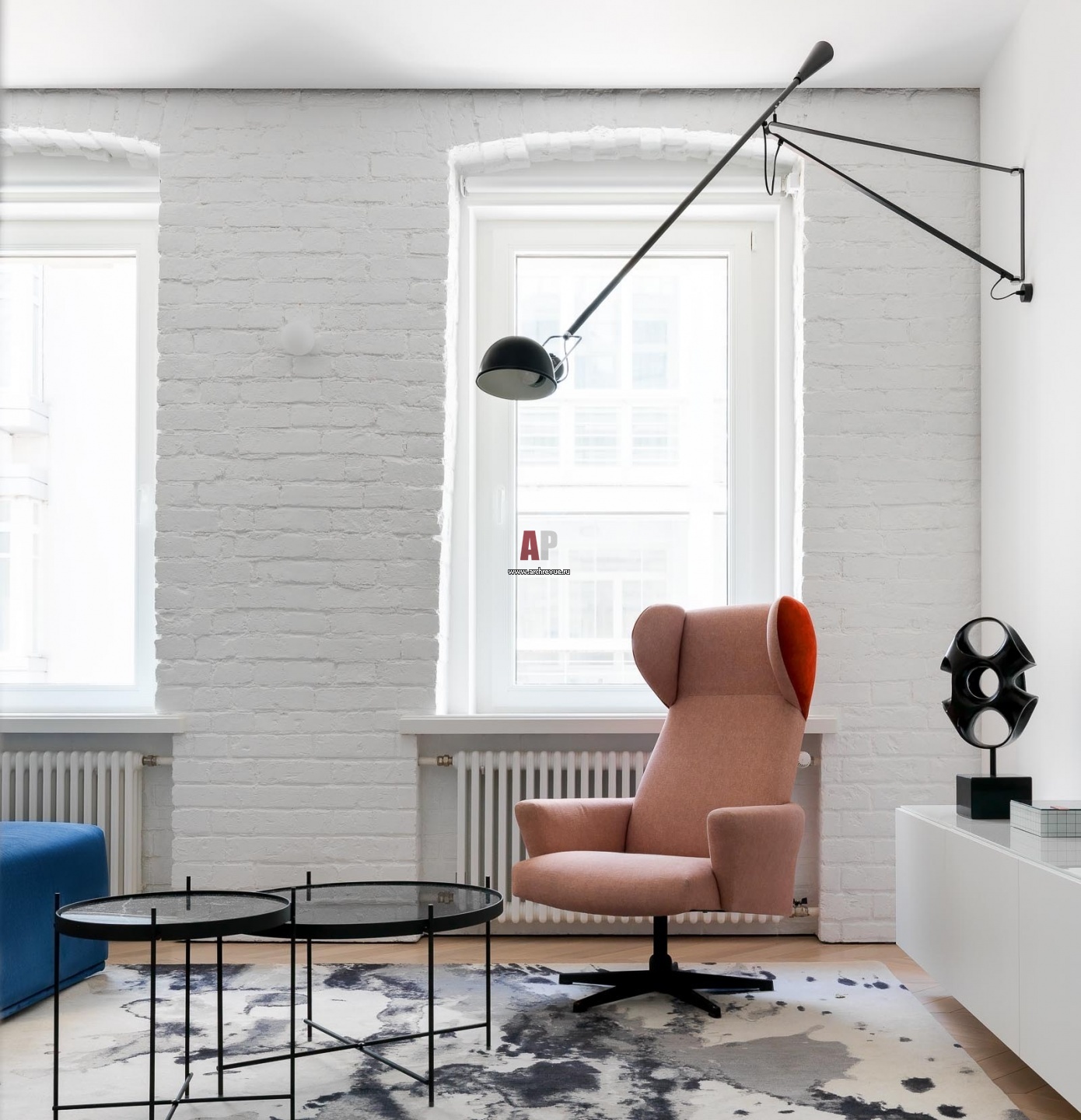 Современная квартира с белыми кирпичными стенами и винтажными предметами.