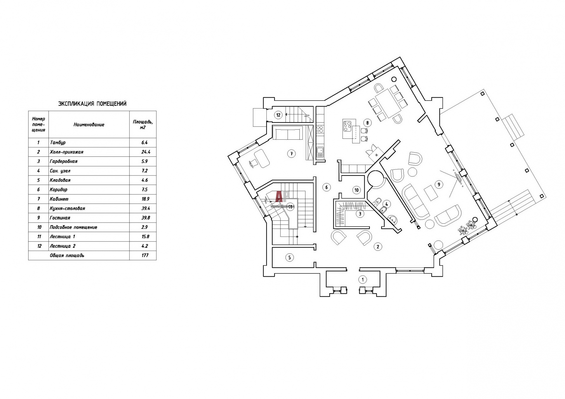 Планировка 1 этажа 3-х этажного дома в стиле канти.