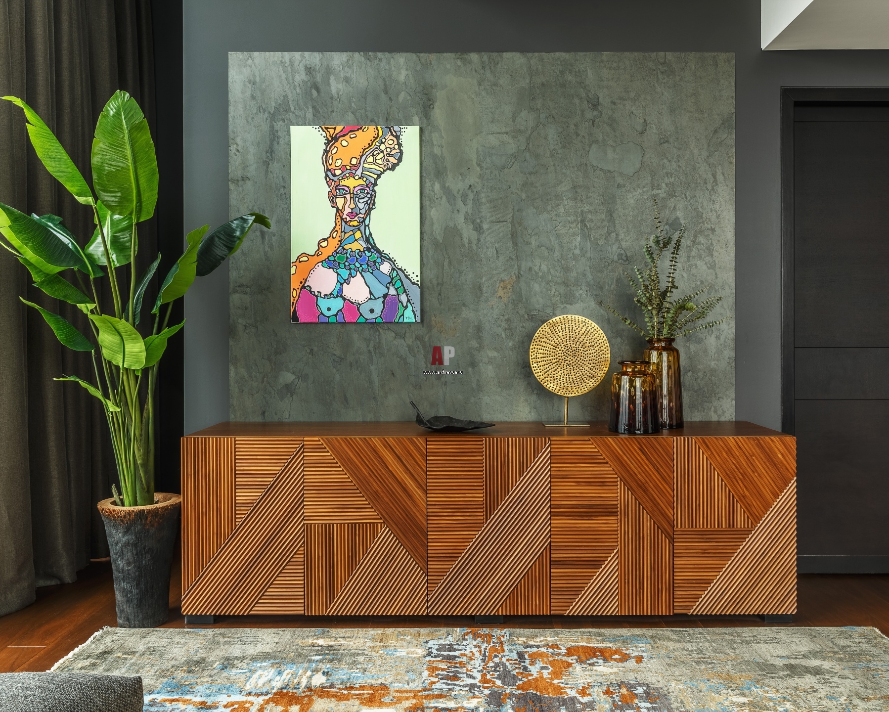 Интерьер гостиной. Стена оформлена панелью из шпона камня, Porcelanosa (коллекция AIR Slate). Комод, Emmemobili. Картина «Аида» работы Татьяны Шохиревой. Статуэтка из металла, Crate and Barrel.
