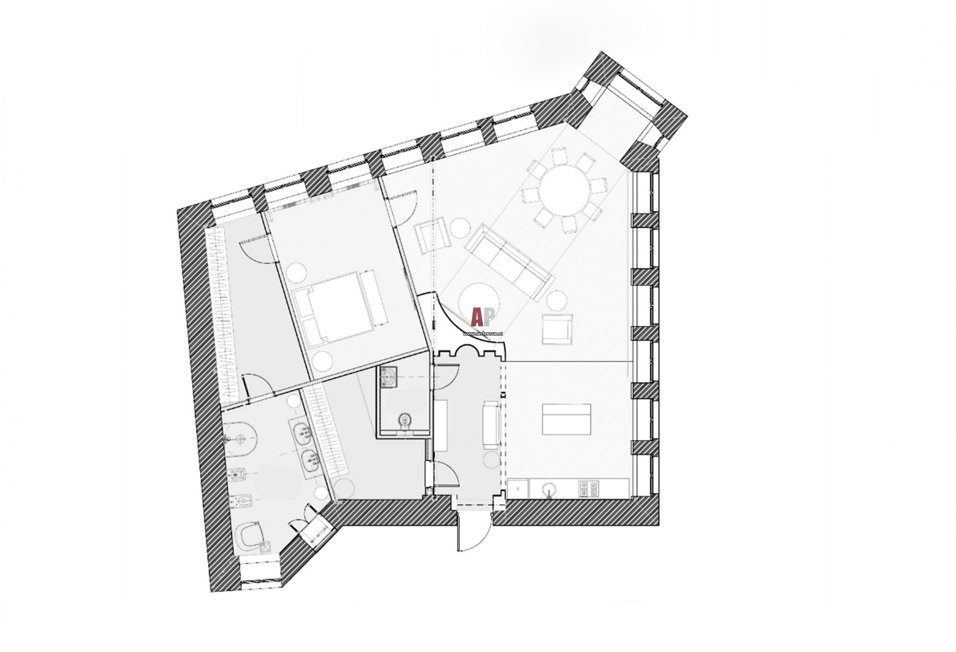 План двухкомнатной квартиры со сложной геометрией. Общая площадь – 125 кв. м.