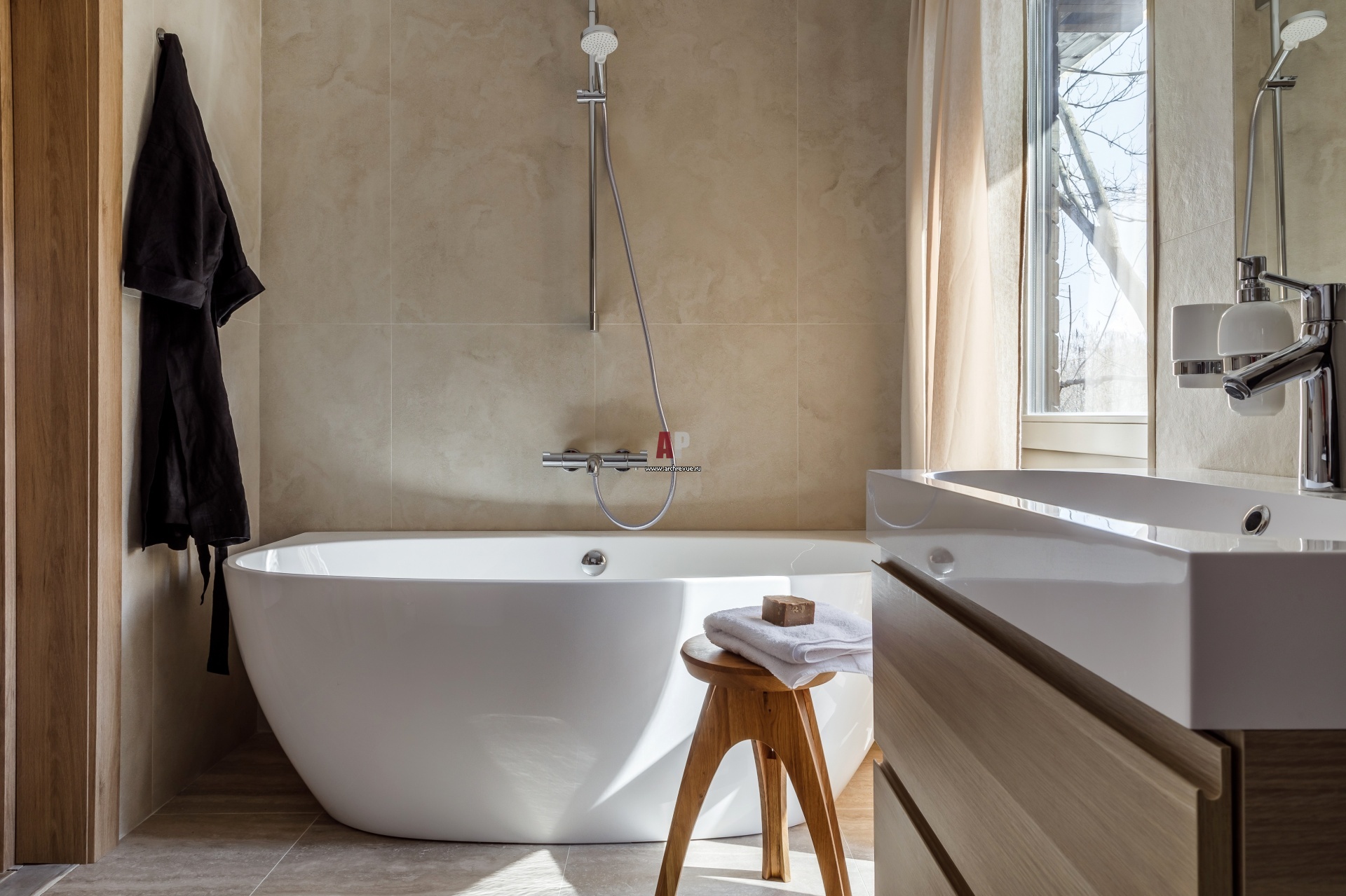 Ванная комната на втором этаже с окном. Плитка, Kerama Marazzi. Отдельностоящая ванна, Art&Max, коллекция Milan.