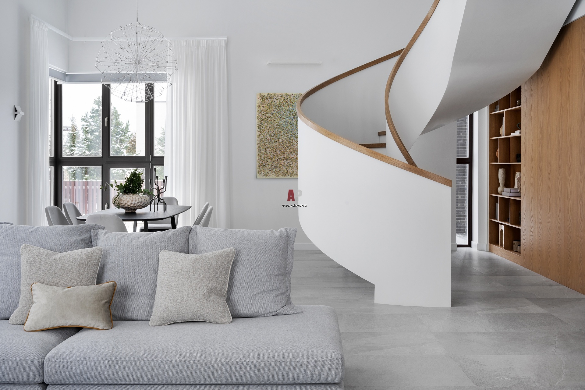 Смысловое ядро дома – винтовая лестница в двухсветной гостиной. Ее пластика подчеркивает крупный масштаб пространства.