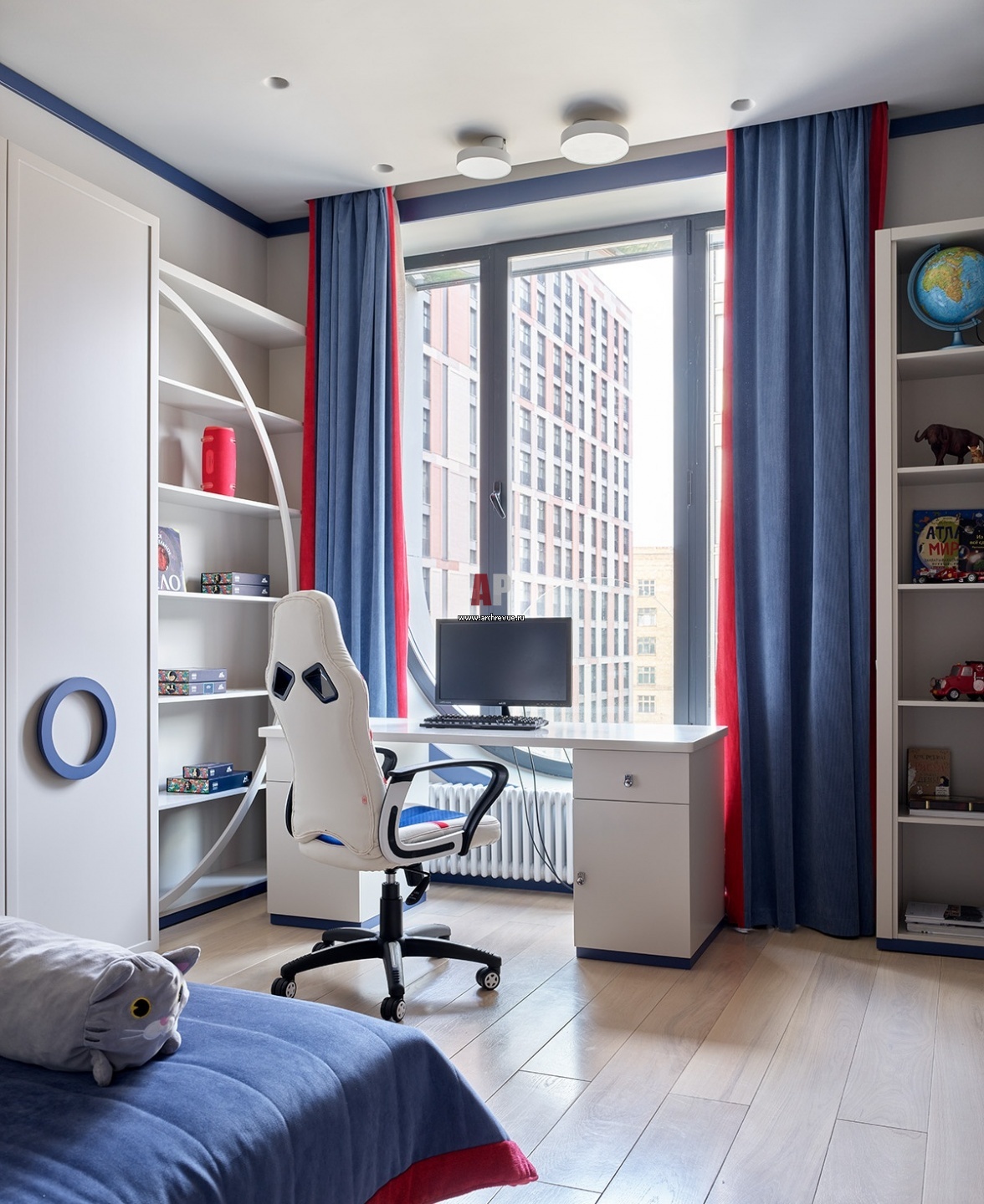 Рабочая зона в комнате сына. Шкаф с радиусными деталями сделан на заказ.