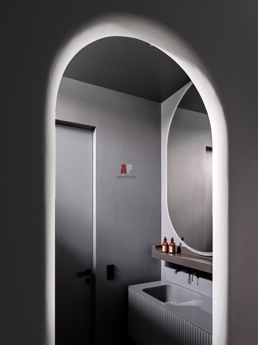 Хозяйская ванная комната. Красивый рассеянный свет в течение всего дня – заслуга арки на входе и углового окна-«иллюминатора» в спальне.