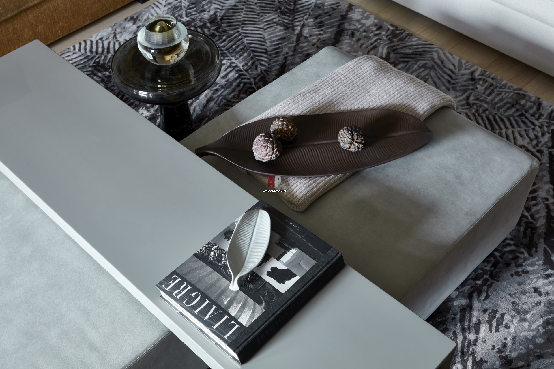Интерьер гостиной. Подносы в виде пальмовых листьев, Bosa. Ковер со стилизованным пальмовым узором, Tai Ping.