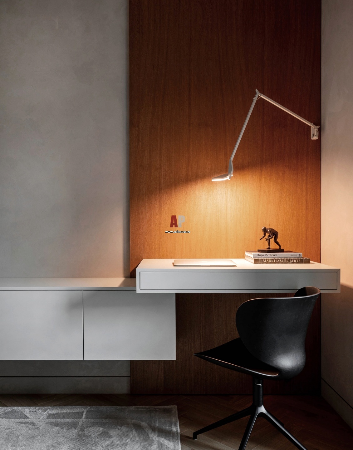 В отделке столярных изделий в мастер-спальне шпон сочетается с пастельными тонами эмали. Подвесная тумба под телевизор переходит в небольшой письменный столик с выдвижным ящиком. Рабочий стул, BoConcept. Свет, Panzeri. Декор, Vitra.