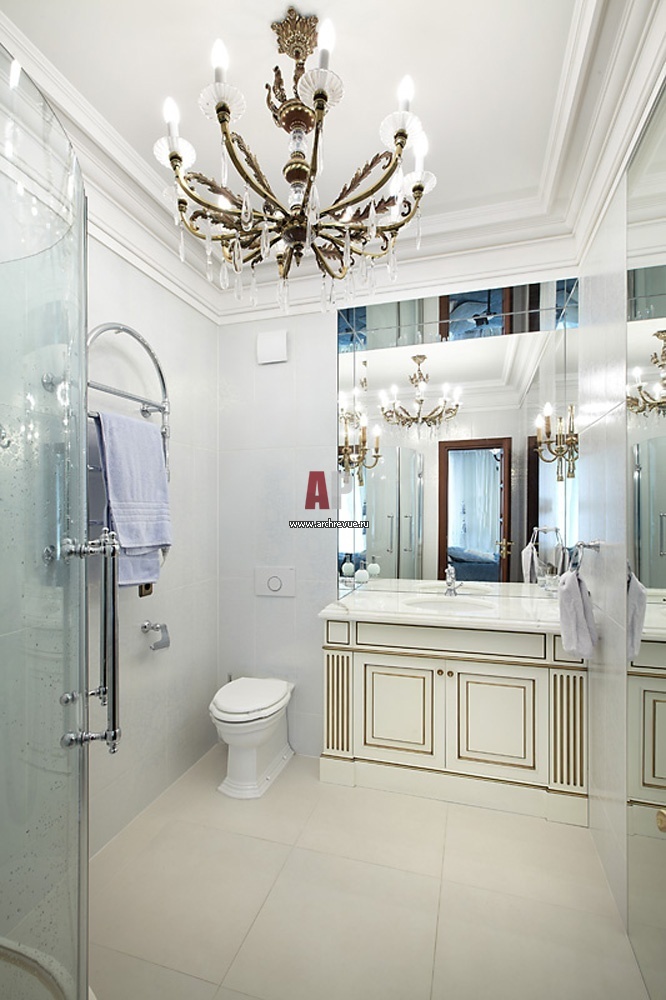 Интерьер хозяйской ванной комнаты решен в сдержанном классическом стиле. Мебель выполнена под заказ, дверцы - состаренное дерево с позолотой.
