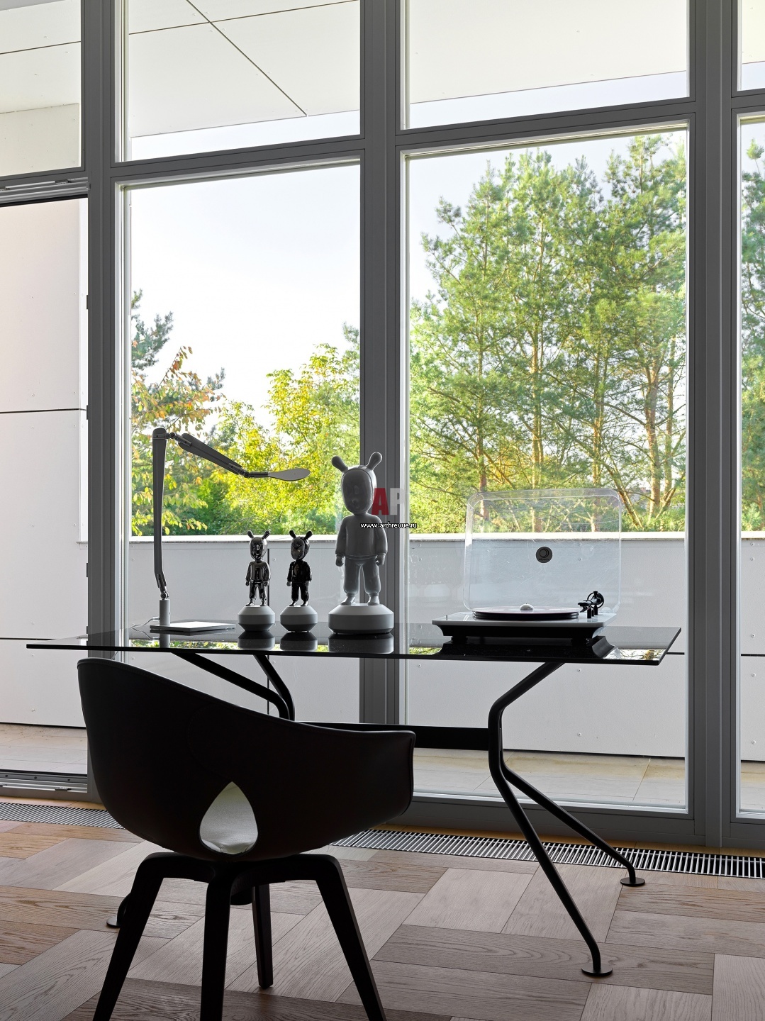 Рабочая зона в комнате дочери. Из нее есть выход на общую лоджию второго этажа. Письменный стол, Jose Martinez Medina. Кресло, Poltrona Frau.