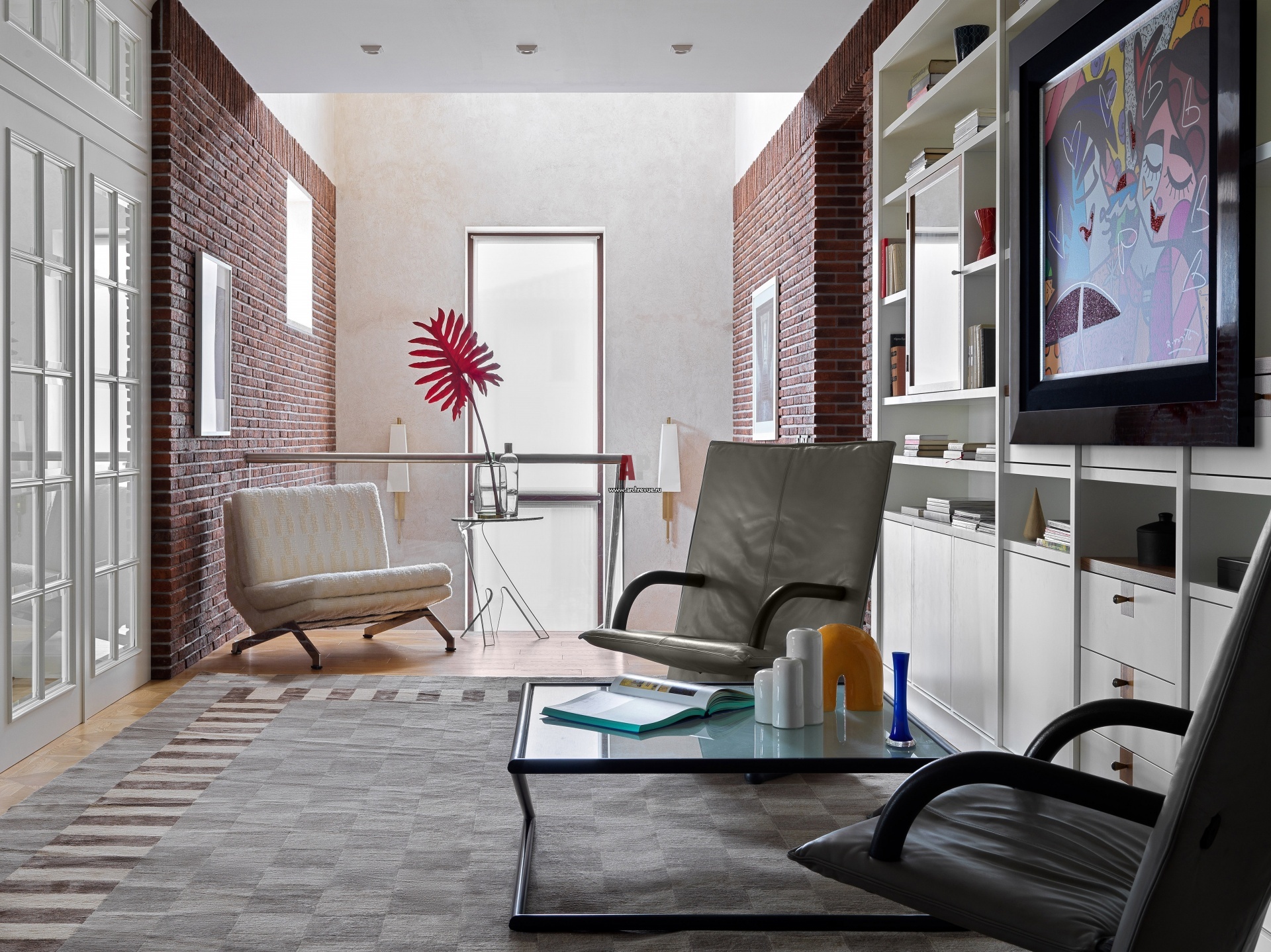 Холл-библиотека на втором этаже. Винтажные кресла, Arflex, дизайн Burkhard Vogtherr, Италия, 1980-е гг. Винтажный стол, Голландия, 1960-е гг.