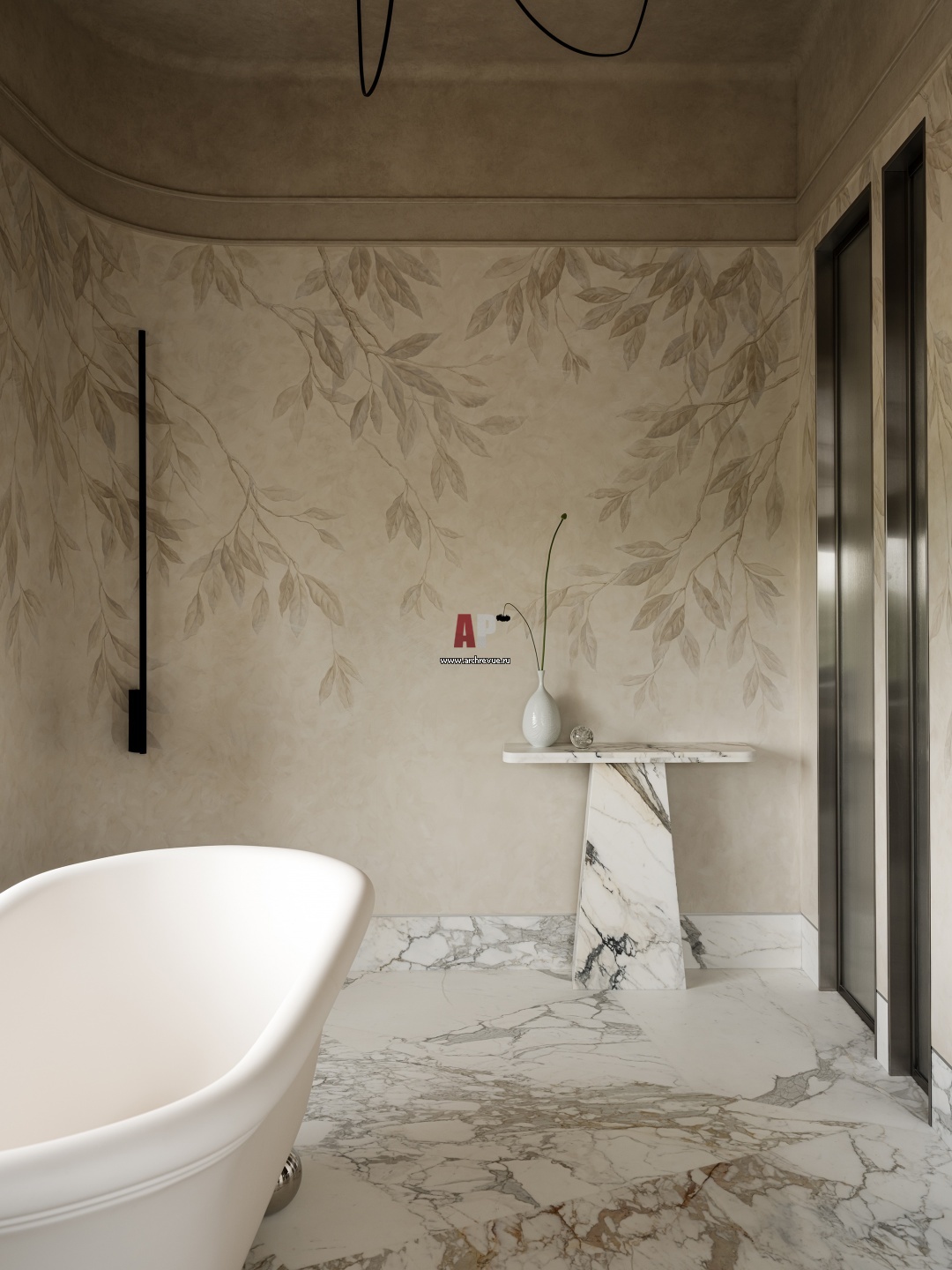 Санузел. На полу – мрамор Calacatta Vagli в авторской раскладке. Стены оформлены художественной росписью по штукатурке. Консоль из мрамора.
