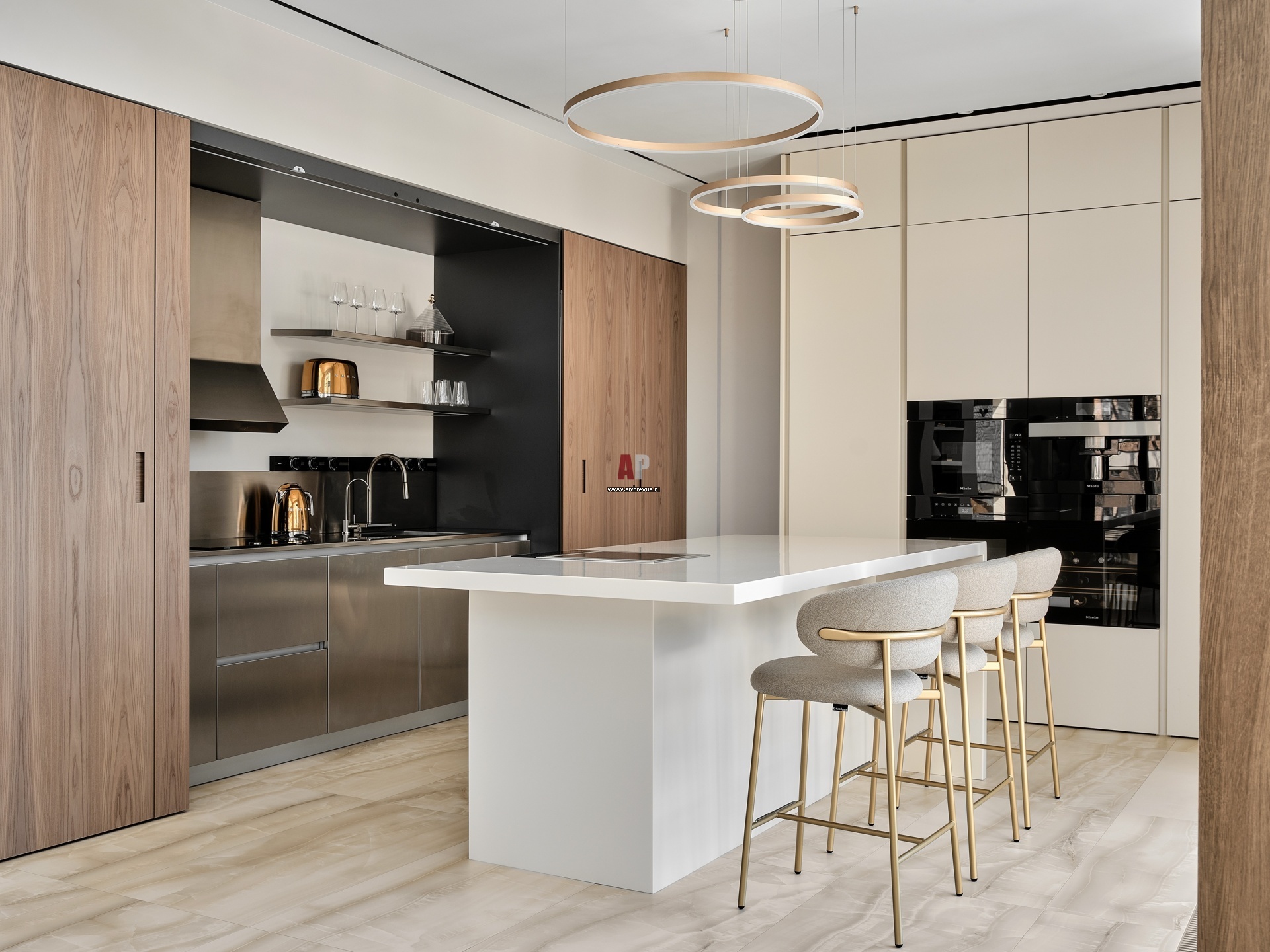 Зона кухни. Кухонный гарнитур, Aster Cucine, модель CONTEMPORA. Раздвижные фасады превращают рабочую кухню в полностью закрытый блок.
