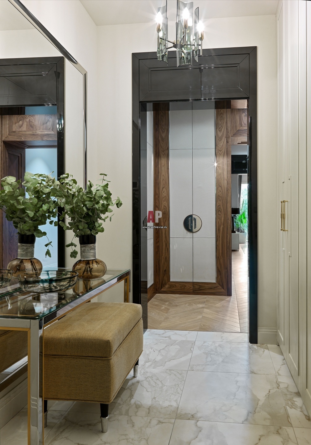 Прихожая. Вид на проходной холл. Встроенные шкафы выполнены на заказ. В их отделке использовано дерево с эмалью, шпон ореха и кожа. Люстра, винтаж.