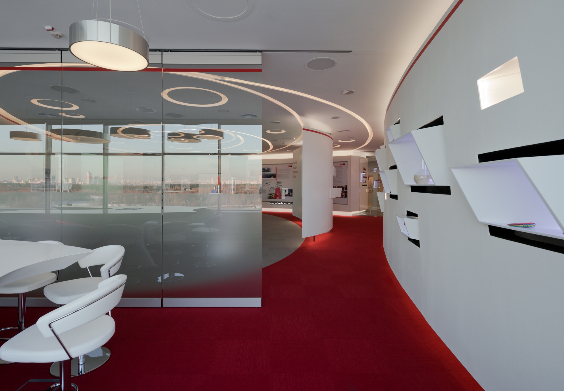 Переговорная отделена мобильной раздвижной перегородкой из стекла. На полу – ковровая плитка Desso красного цвета.