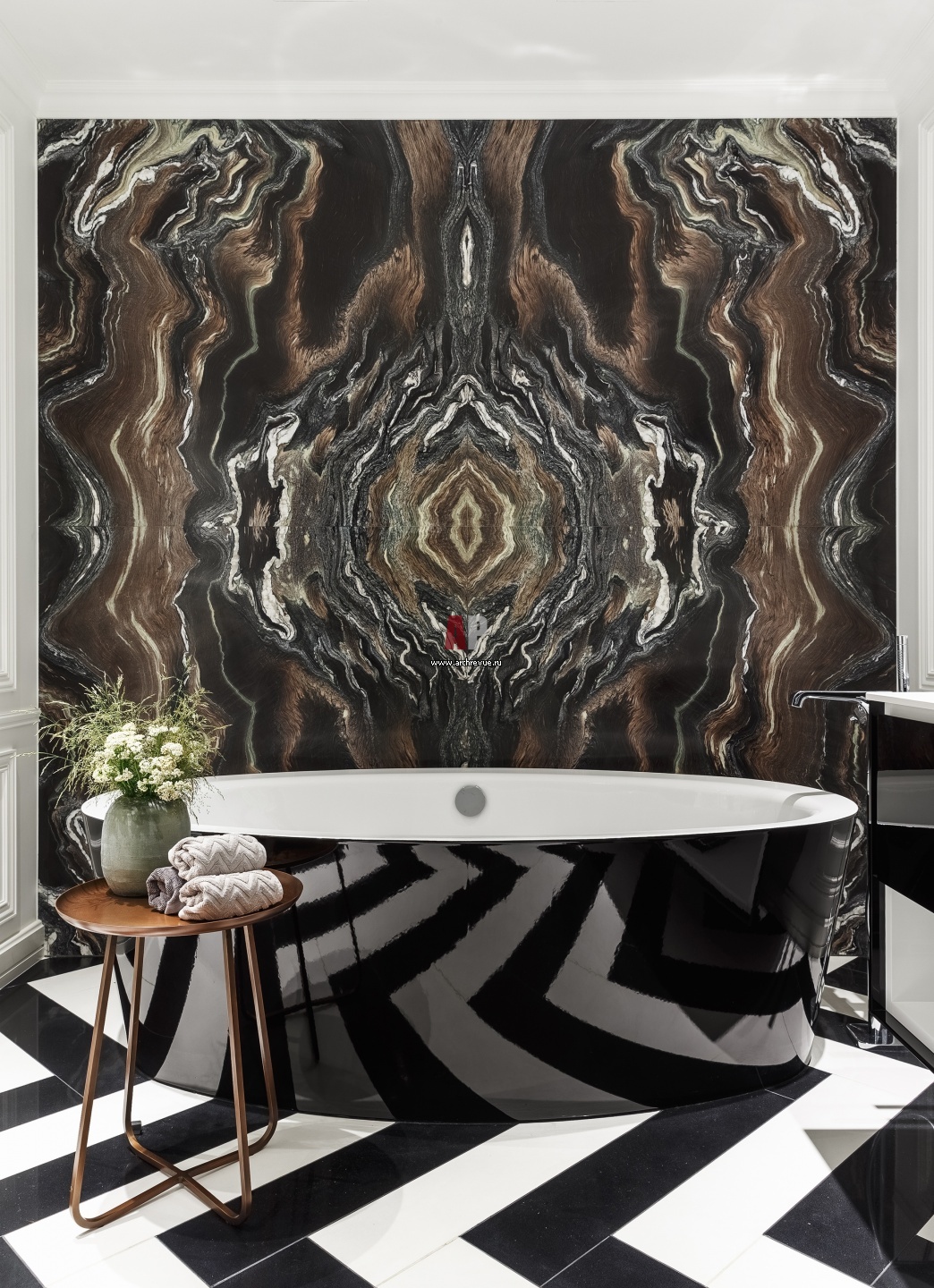 Украшение ванной комнаты – настенное панно из мрамора Cipollino Ondulato. На полу – черно-белый кварцевый камень. Отдельно стоящая ванна выбрана в черном дизайне. Аксессуары медного и золотого цветов.