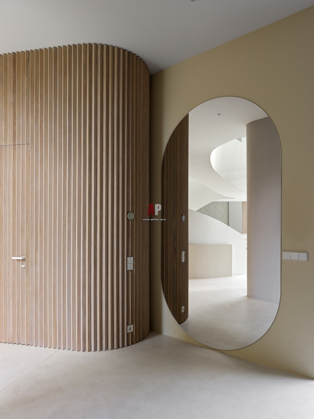 Холл. Гардеробная оформлена деревянными рейками с треугольным сечением. В овальном безрамном зеркале отражается впечатляющая конструкция лестницы.