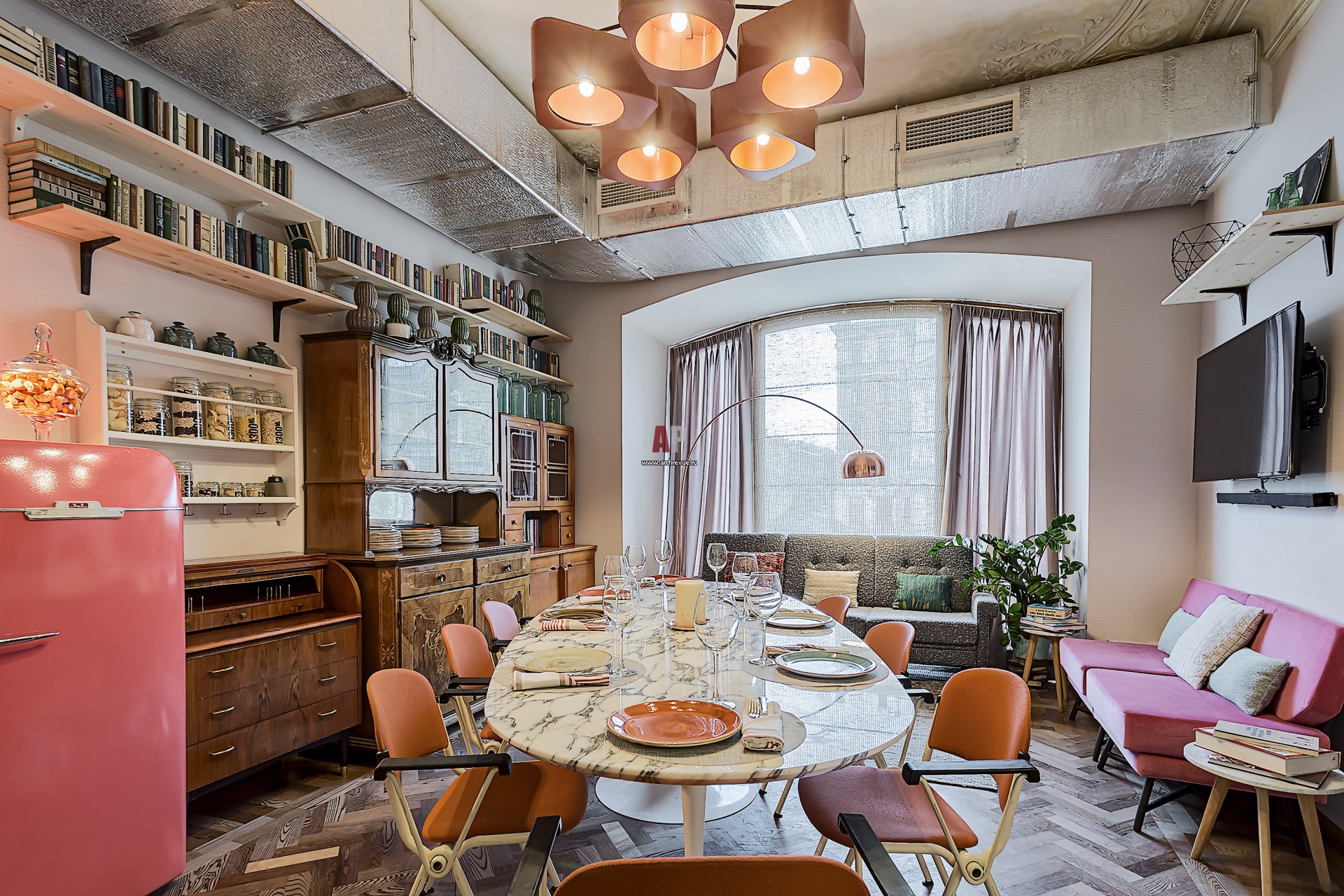 Секретный зал «Квартира» для частных мероприятий и банкетов на небольшую компанию. В нем помимо огромного овального мраморного стола на 14 человек находится небольшая открытая кухня для приготовления блюд прямо при гостях.