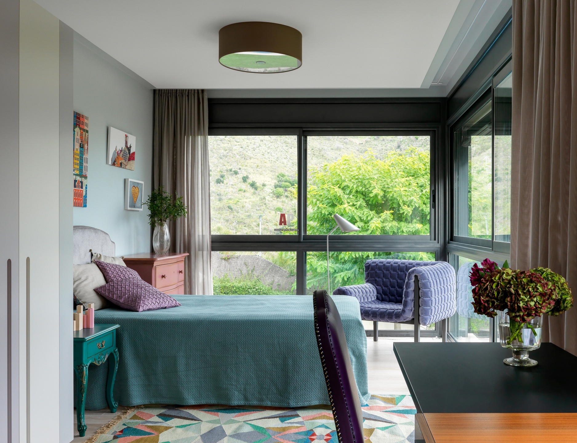 Комната старшей дочери с панорамными окнами. Кровать, Treca Interiors Paris. Кресло, Ligne Roset. Живопись, художник – Надежда Суворова.