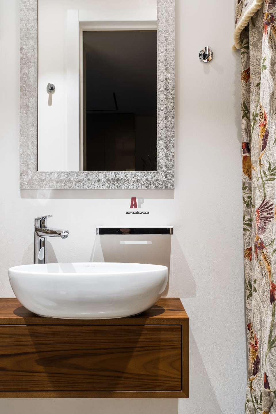 Гостевой санузел. Керамогранит, Italon. На стене – нейтральная штукатурка с бархатистой текстурой. Раковина, Sanita Luxe. Смеситель, Grohe. Умывальник, МДФ со шпоном тика.