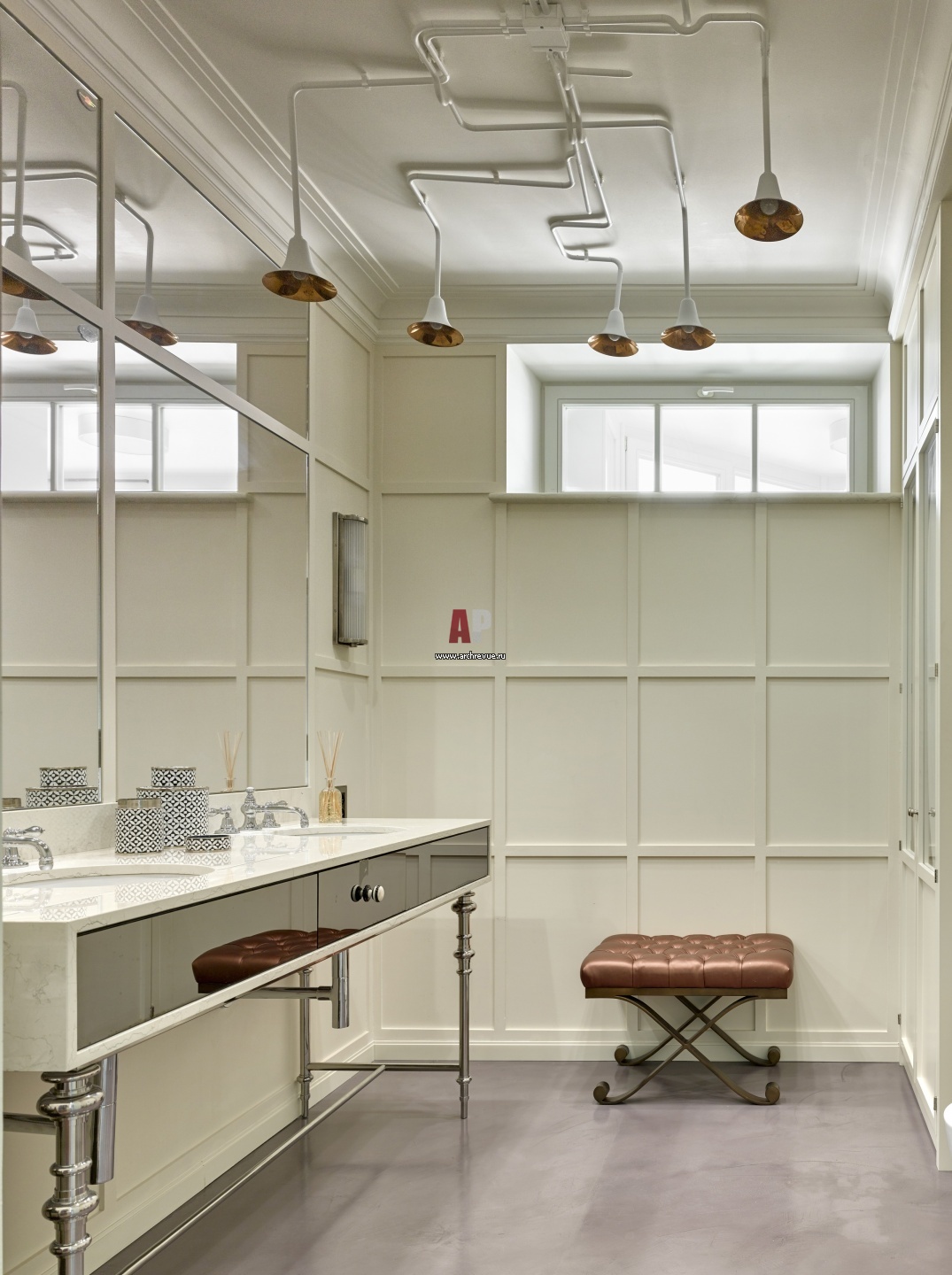 Хозяйская ванная с окном-фрамугой. Светильник, напоминающий переплетение металлических труб, Ontwerpduo. Бра, Circa Lighting. Пуф, Schumacher.