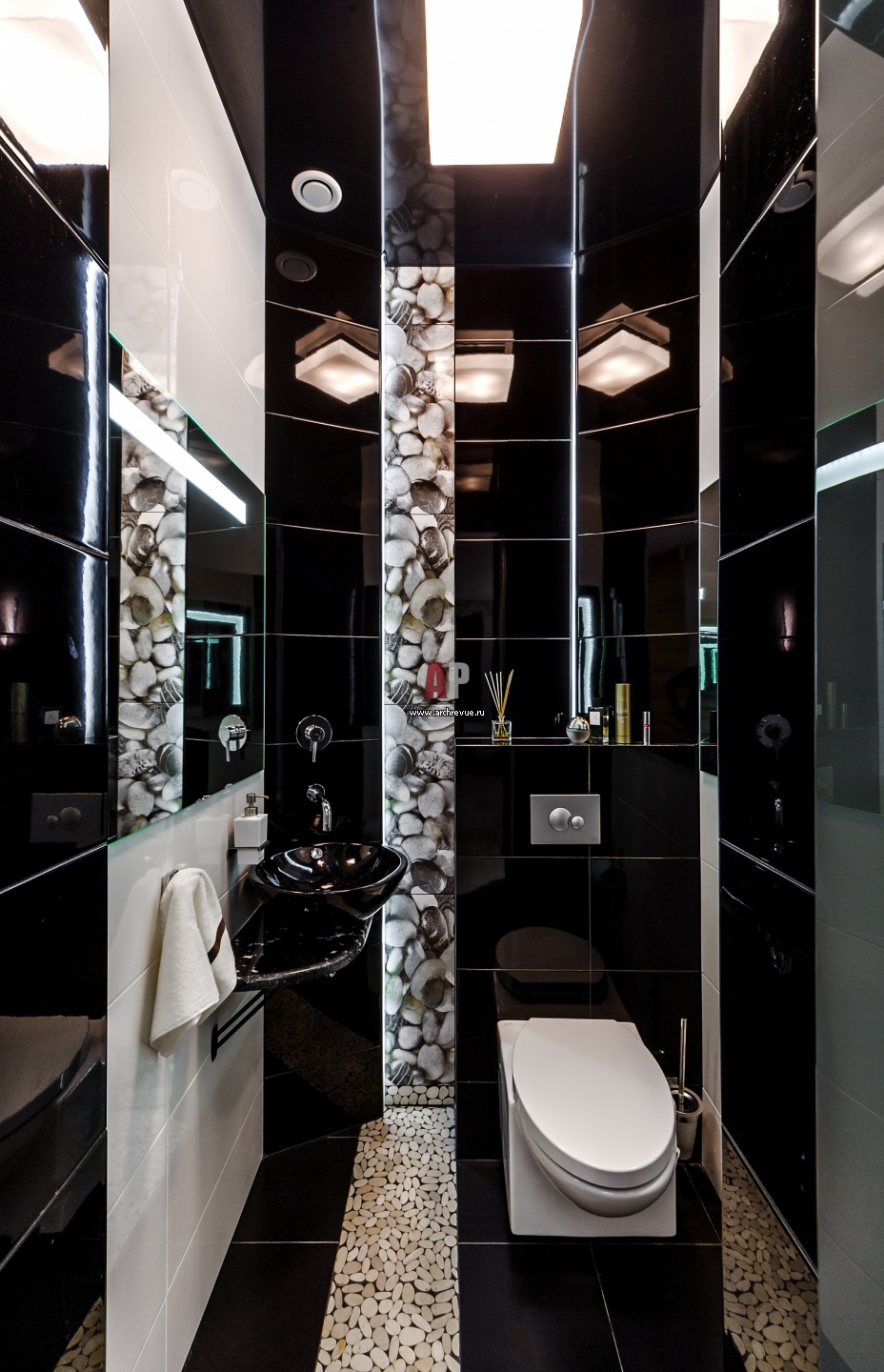 На фото – графичный, черно-белый санузел. В качестве декора использованы лакированные панели с изображением морской гальки.