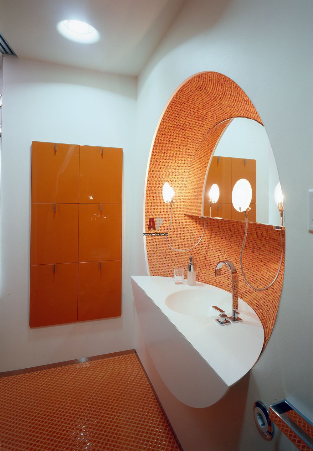 Раковина оборудована в выступающей в прихожую круглой нише. Она сделана на заказ кориана, поставщик компания Respect® .