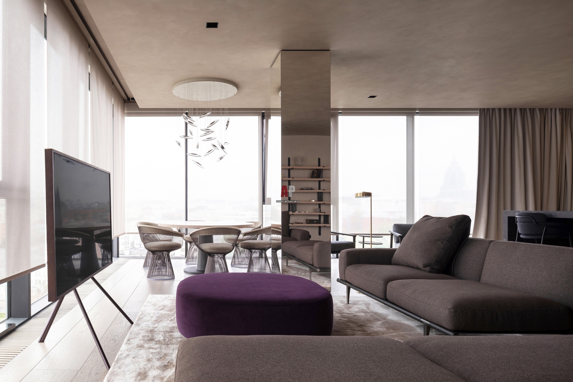 Гостиная. Стены и потолок окрашены минеральной краской с текстурой. Несущая колонна облицована зеркалами. Диван, Poltrona Frau, модель Let It Be. Кресла, столик, сиреневый пуф, Molteni&C, модели Gillis, Vicino, Domino.