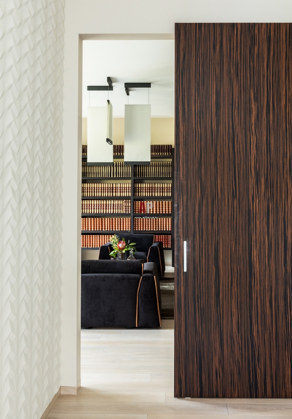 Вид из прихожей на кабинет-библиотеку. По всей квартире использованы раздвижные двери в темном шпоне, Lualdi Porte. Они создают эффект открытого перетекающего пространства.