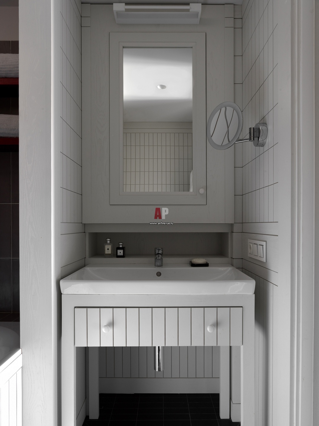 Ванная комната. Деревянные панели выполнены из беленого ясеня, их ритмичная раскладка повторяет рисунок метлахской плитки. Сантехника, Villeroy & Boch.