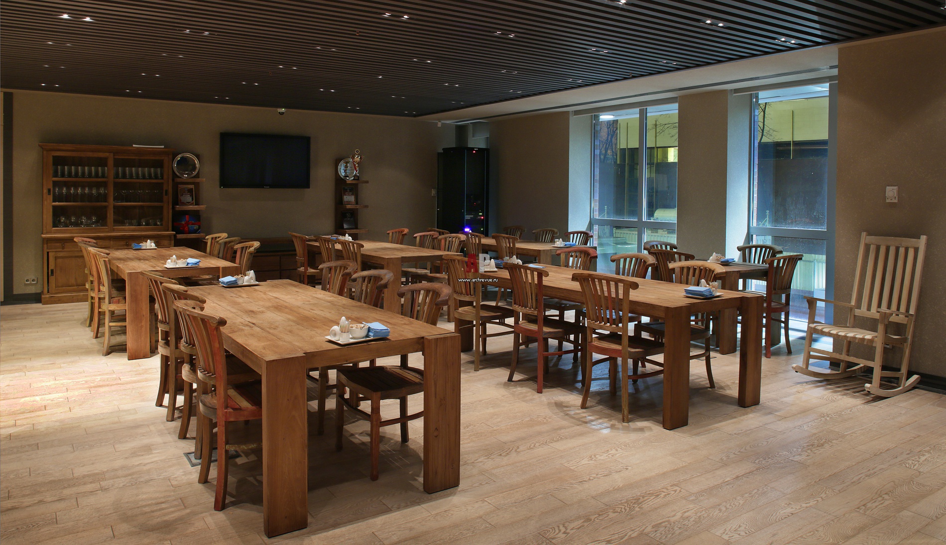 Кафе для сотрудников. Деревянный реечный потолок сочетается с «основательной» мебелью из натурального тика. Деревянные массивные буфеты с посудой создают домашнюю обстановку.
