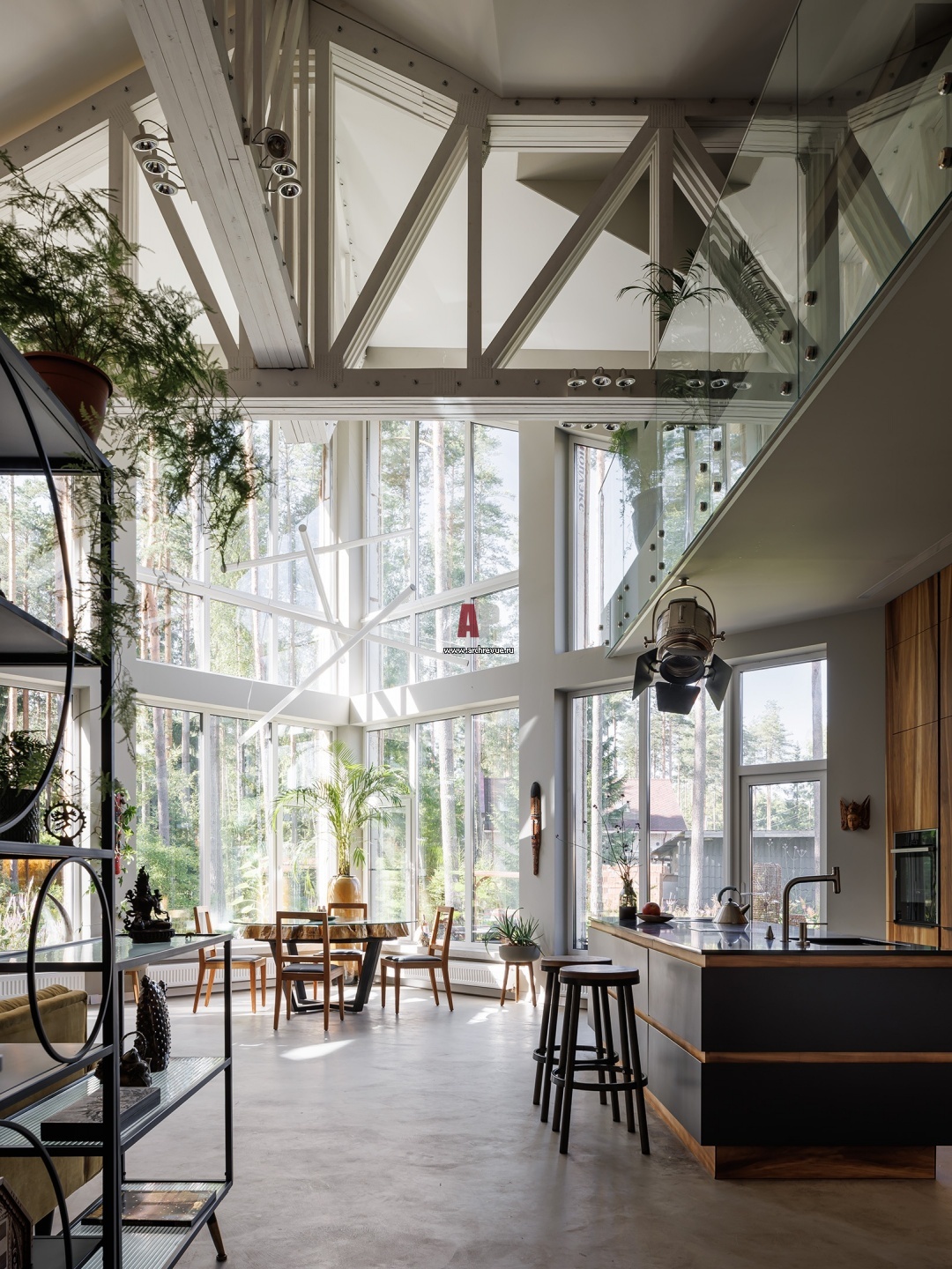 Дом архитектора. Украшение интерьера общей зоны – массивные потолочные фермы из крашеного металла.