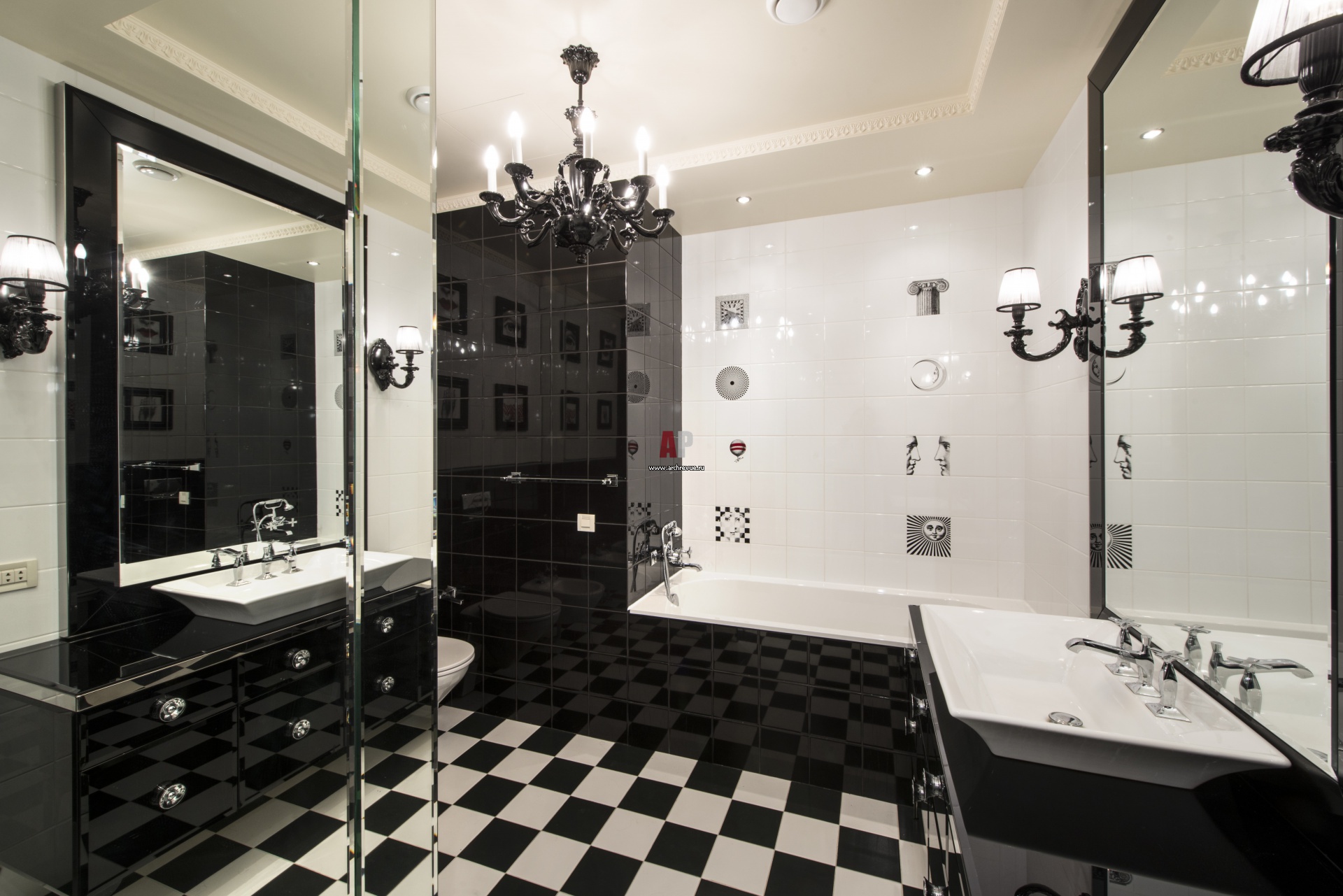 Дизайн интерьера ванной комнаты. Стены и полы облицованы черно-белой глянцевой плиткой, Ceramica Bardelli. Черный глянцевый умывальник в духе ар-деко, Milldue.