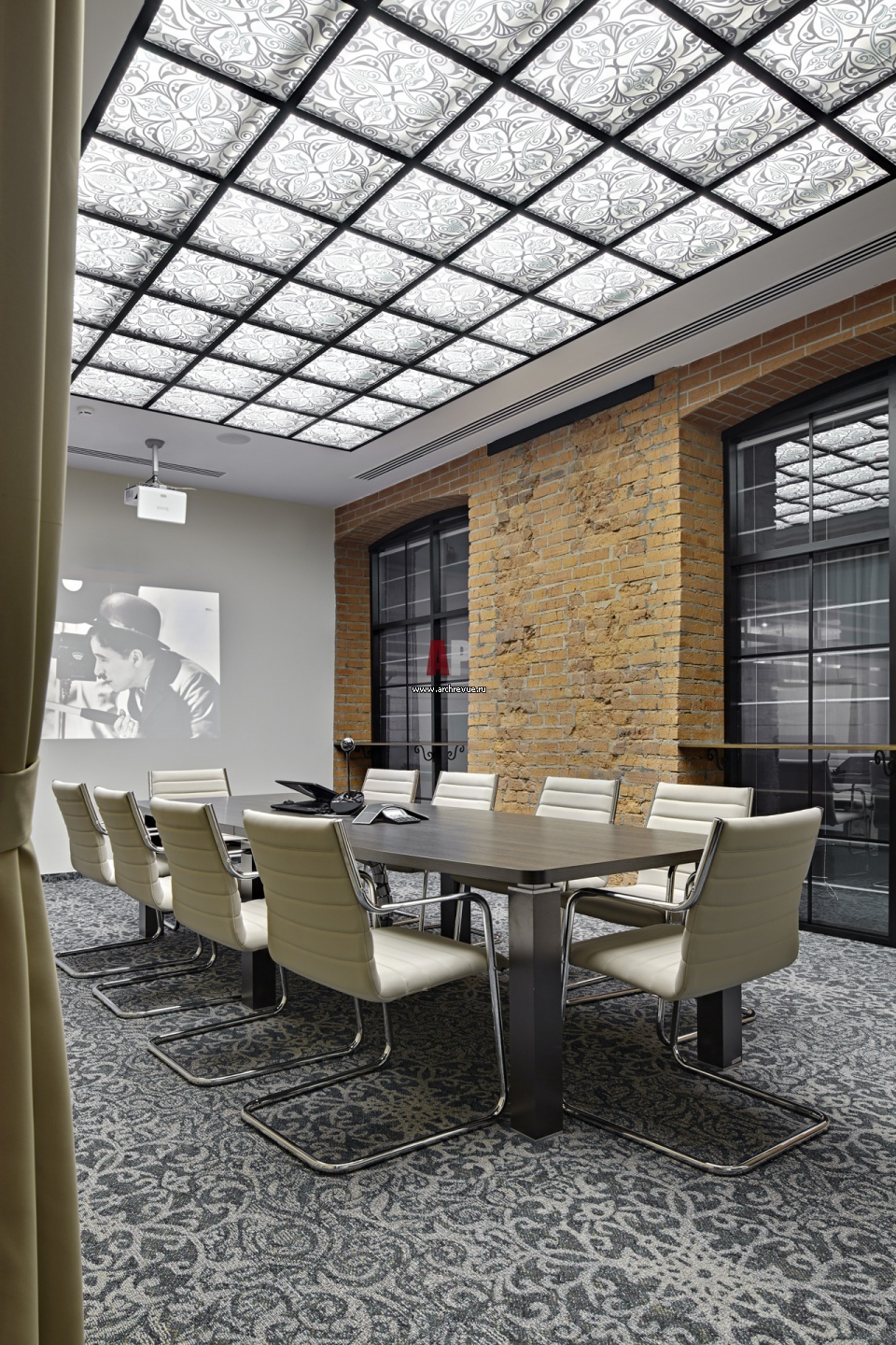 Дизайн интерьера переговорной в офисе. Клинкерный кирпич Feldhaus Klinker в облицовке стен придает помещению сходство с традиционными лофтами. Потолок украшен витражами с цветочным орнаментом.