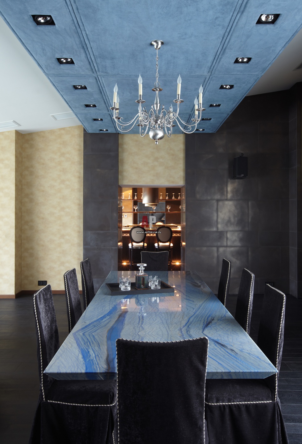 Интерьер столовой с элементами ар-деко. Дверной проем, едущий на кухню, обрамлен керамическим гранитом с имитацией полированного металла. Столешница обеденного стола сделана из голубого афганского мрамора. Потолок над столом украшен панелью из голубой замши.