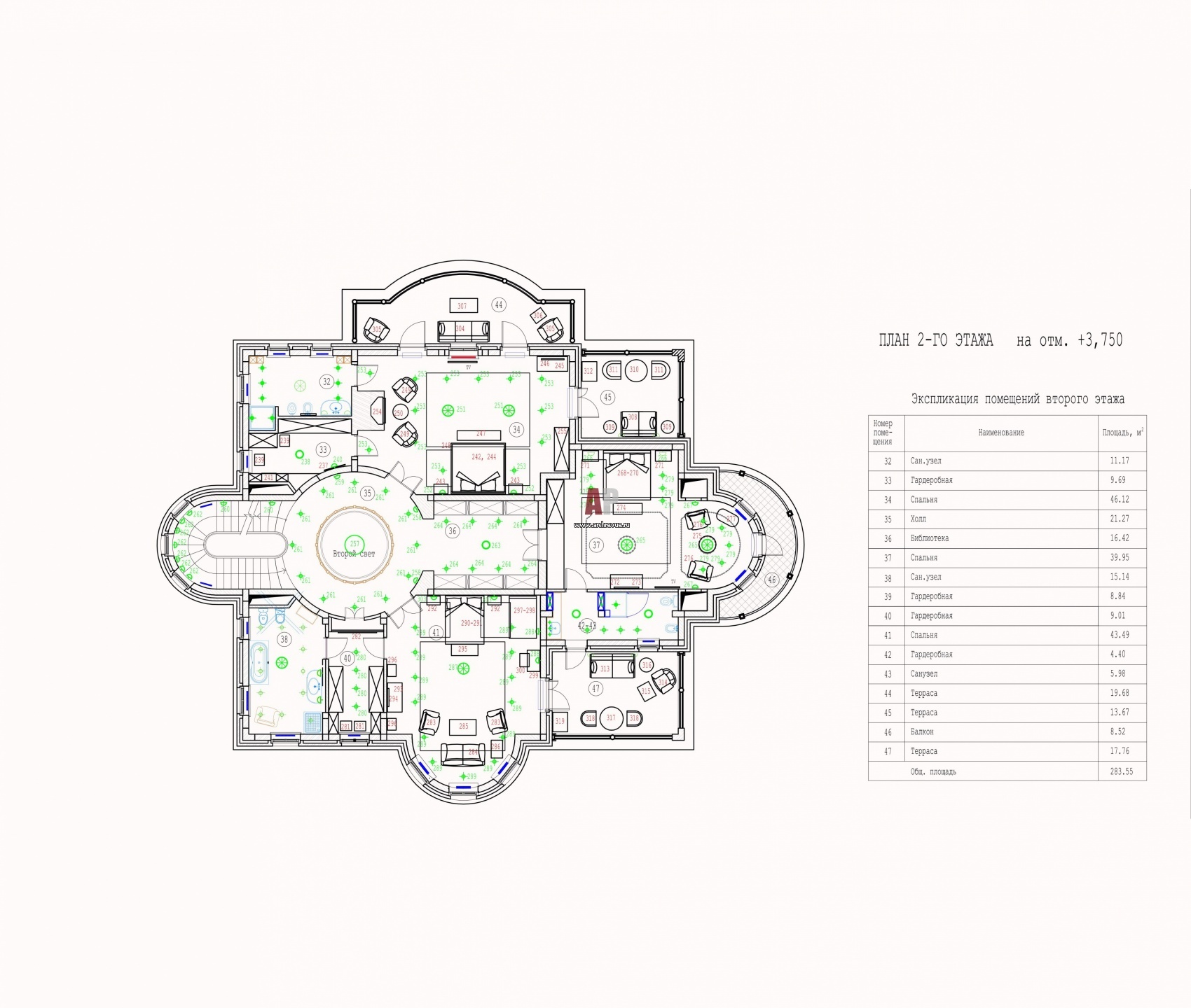 План второго этажа 4-х этажного дома со СПА-комплексом. Общая площадь – 1203 кв. м.