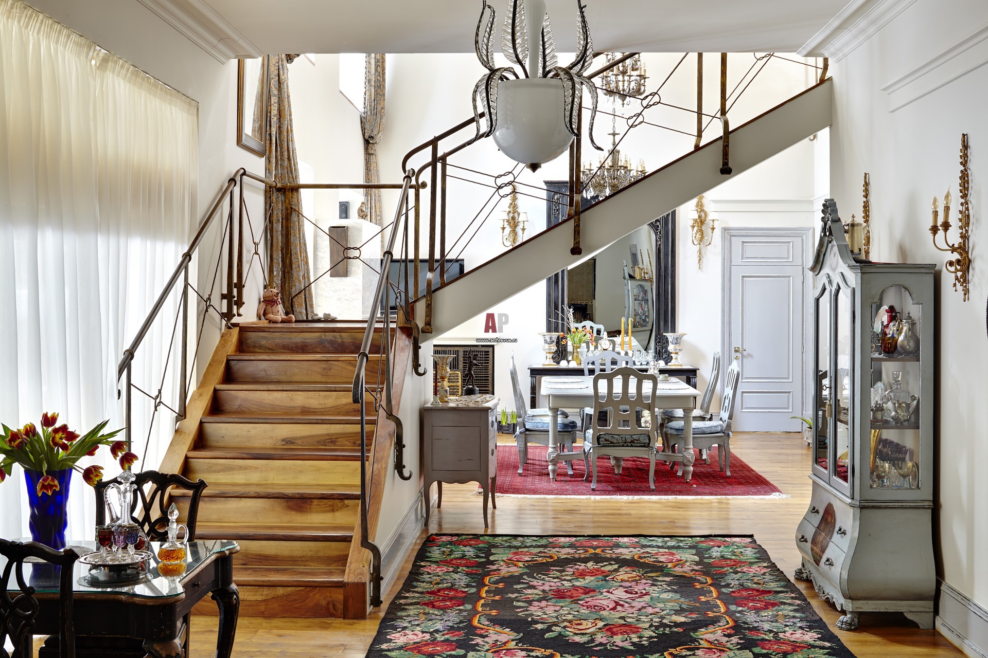 Лестница с кованым ограждением не просто разделяет разные по назначению зоны (столовую и гостиную), но и является эффектным декоративным элементом.