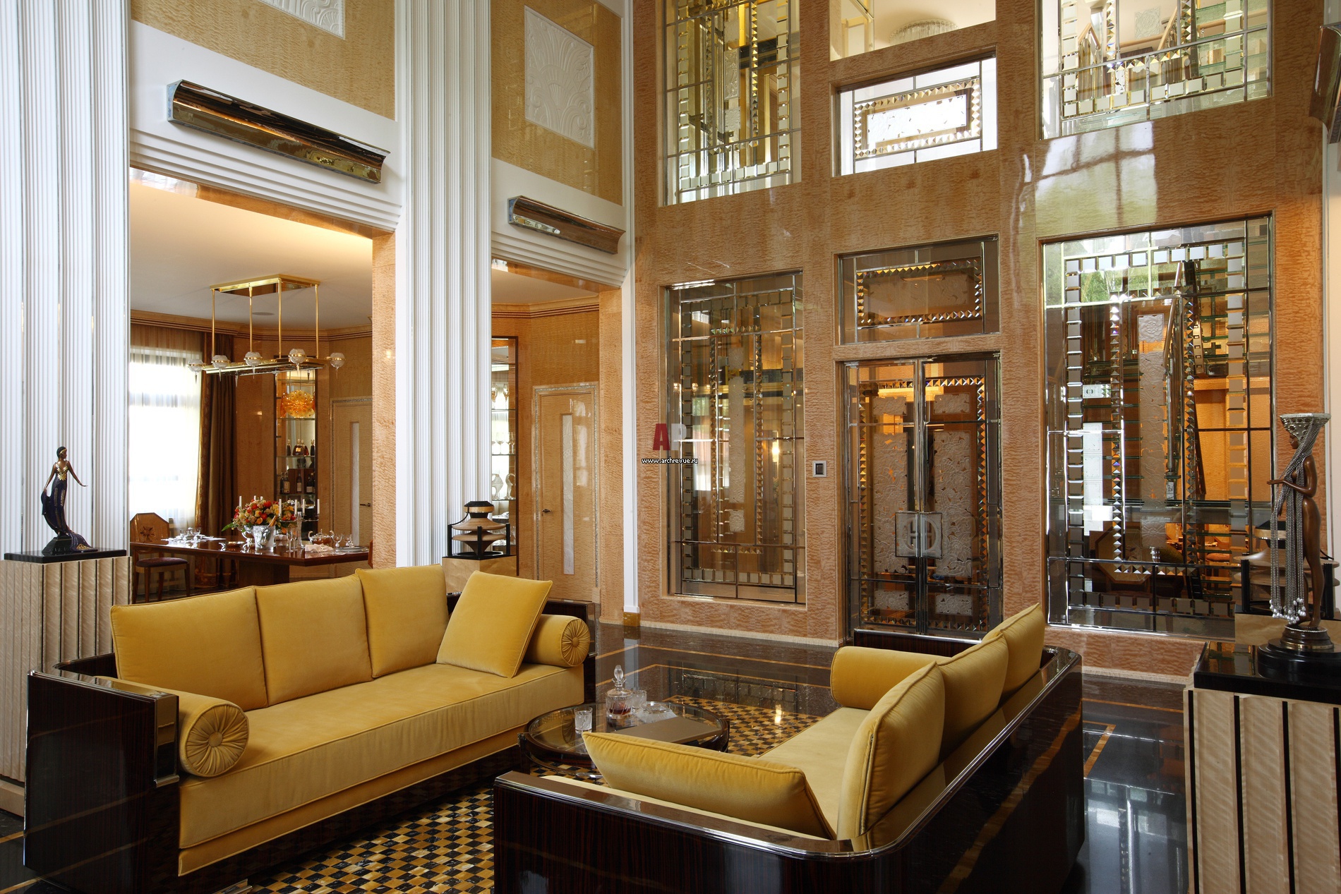 Главным отделочным материалом стен гостиной является светлое дерево с необычной текстурой. Это каповые срезы волнистого клена, покрытые глянцевым лаком. Ощущение легкости и торжественности придают витражи, выполненные в сложной технике с применением мелких и крупных фацетов, сочетания матовых и прозрачных поверхностей, а также изящных выгравированных рисунков.
