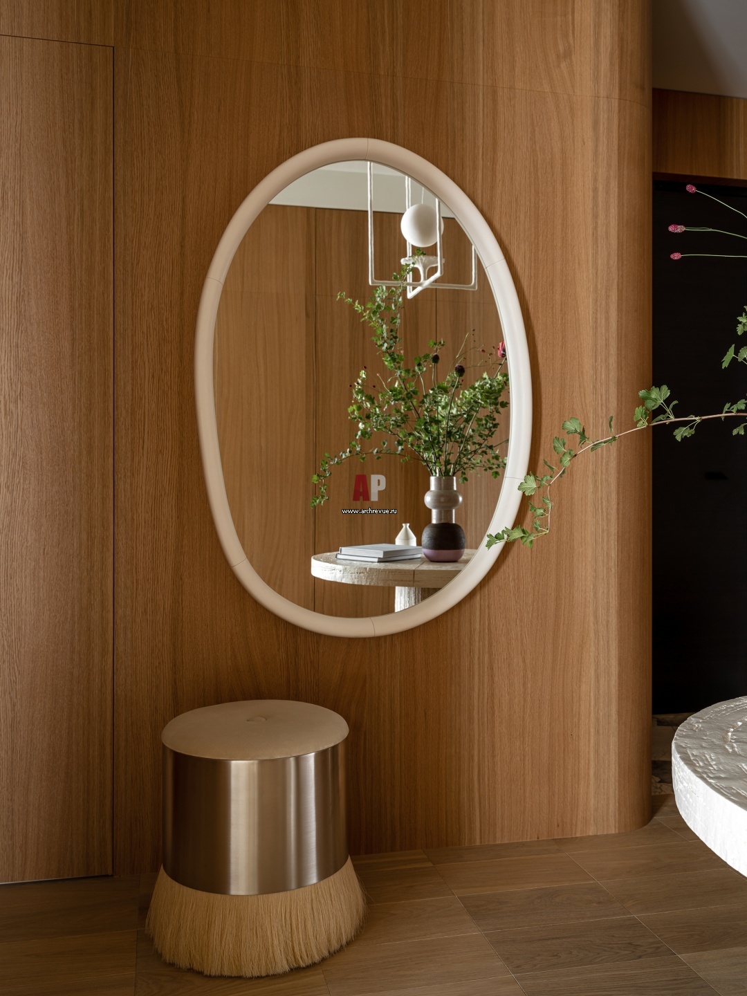 Углы холла сглажены. Округлую форму повторяет керамический стол, Irakli Zaria и зеркало по дизайну Пьера Йовановича. Ваза, Ettore Sottsass, винтаж.