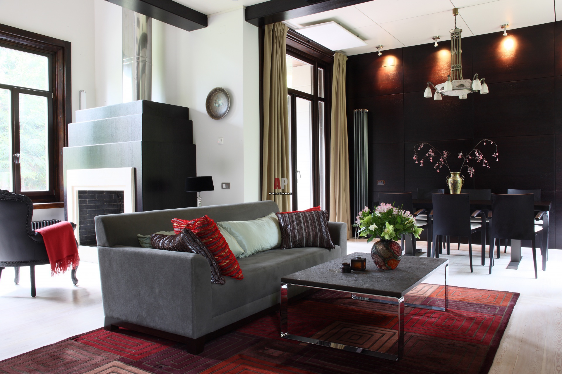 Общая гостиная. Дальняя стена и камин обшиты дубом, тонированным под венге. Диван, JNL.