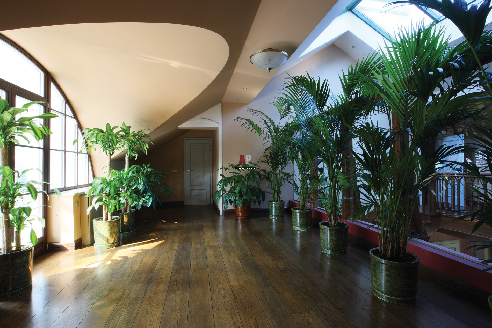 Холл оформлен живыми растениями и похож на зимний сад. На полу – широкая массивная дубовая доска.