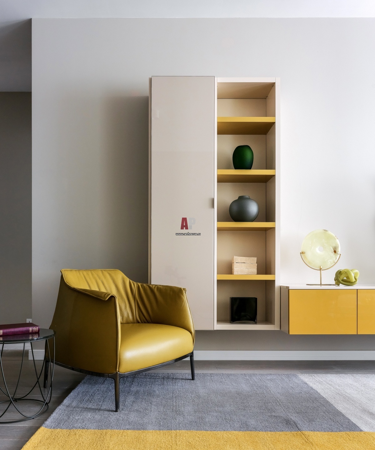 Семейная квартира с яркой мебелью. Мебельная композиция, MisuraEmme. Кожаное кресло Poltrona Frau горчичного цвета.