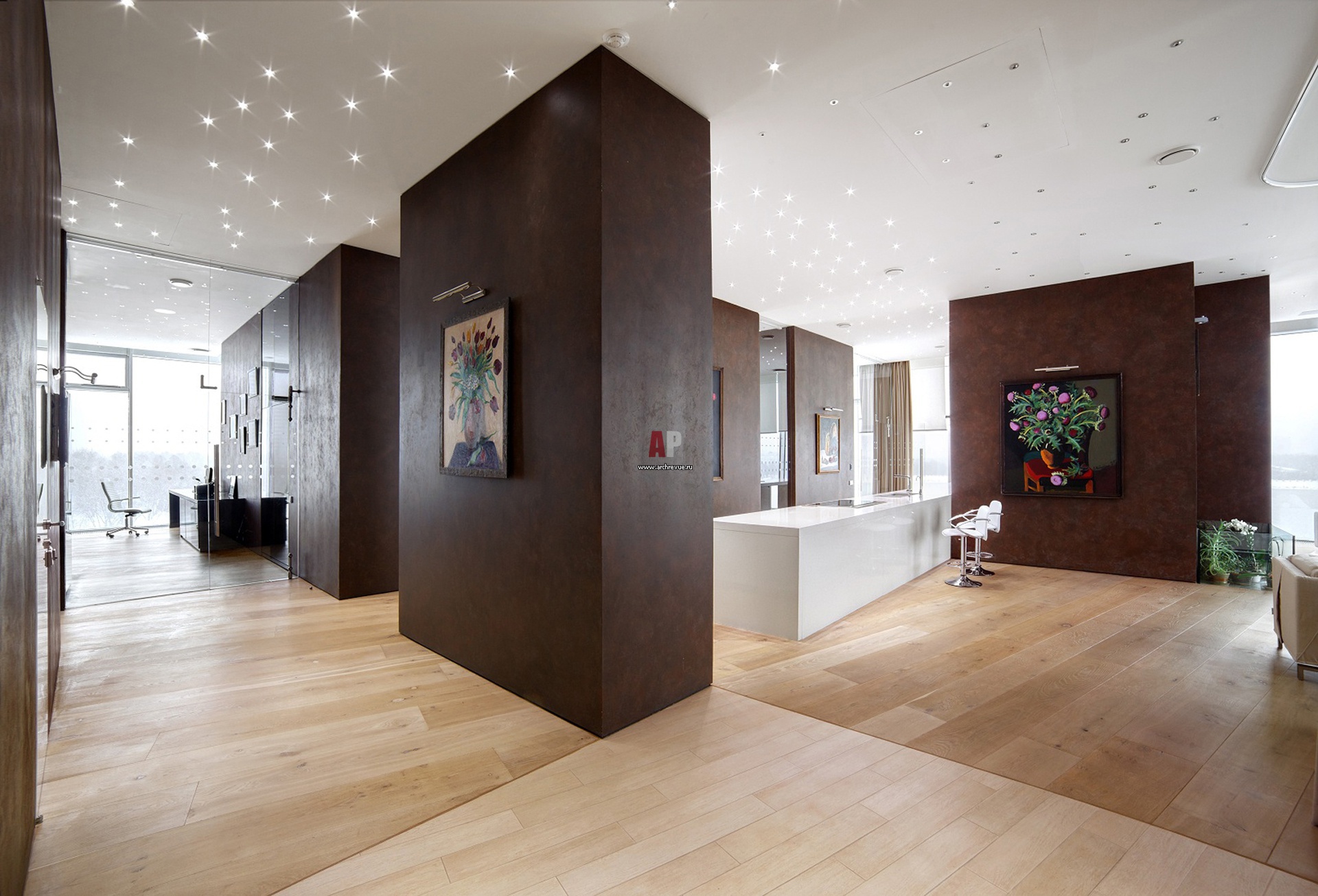 Вид со стороны общей зоны на кабинет, изолированный перегородками из прозрачного стекла. Справа, в глубине помещения – белый кухонный остров.