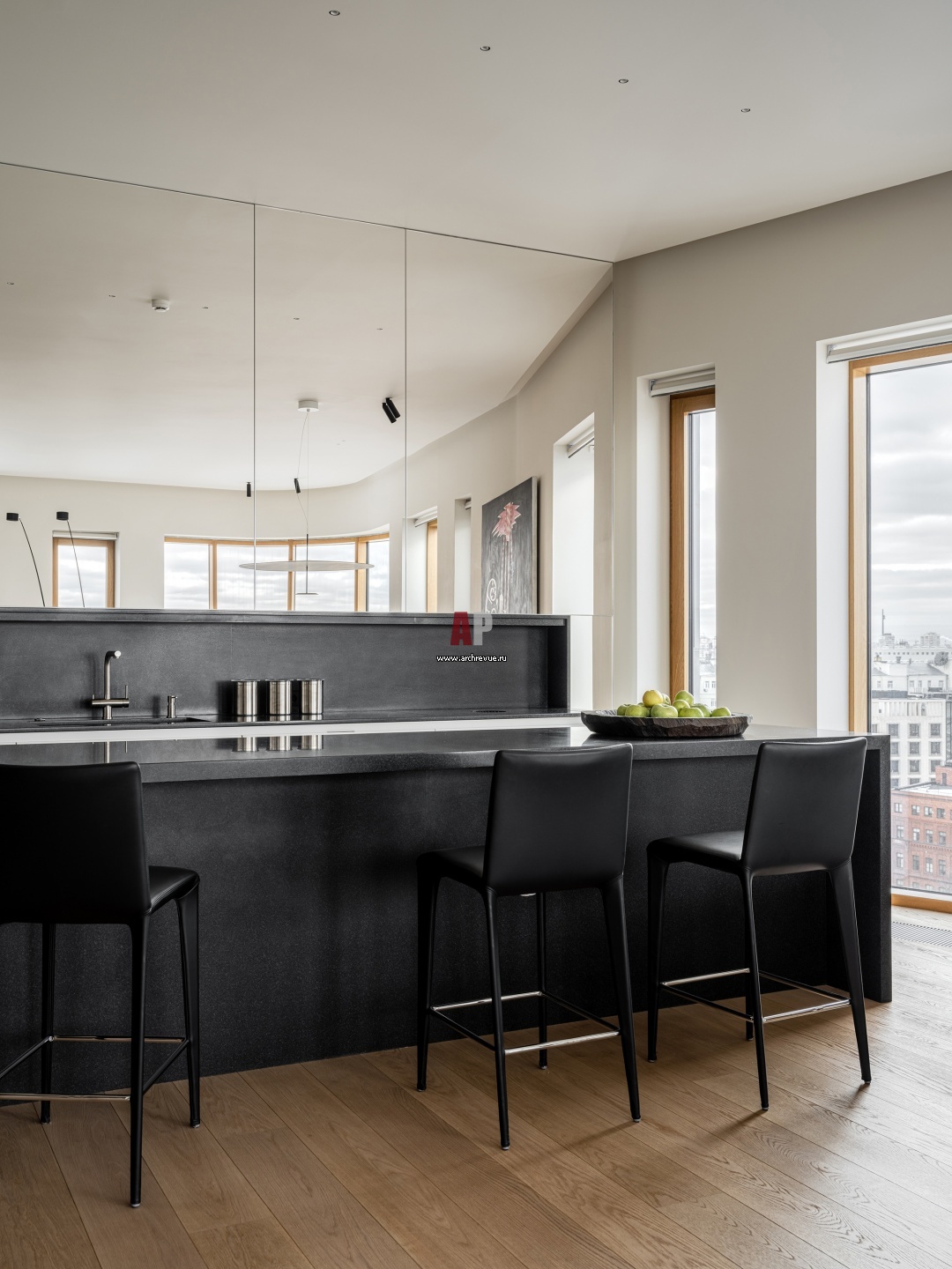 Сделанная частью гостиной кухня выглядит чрезвычайно оригинально. Один модуль со встроенными элементами сделан полностью зеркальным. В зеркальных панелях отражается всю гостиная и панорама города за окнами. Большой и вместительный кухонный остров отделан черным гранитом.