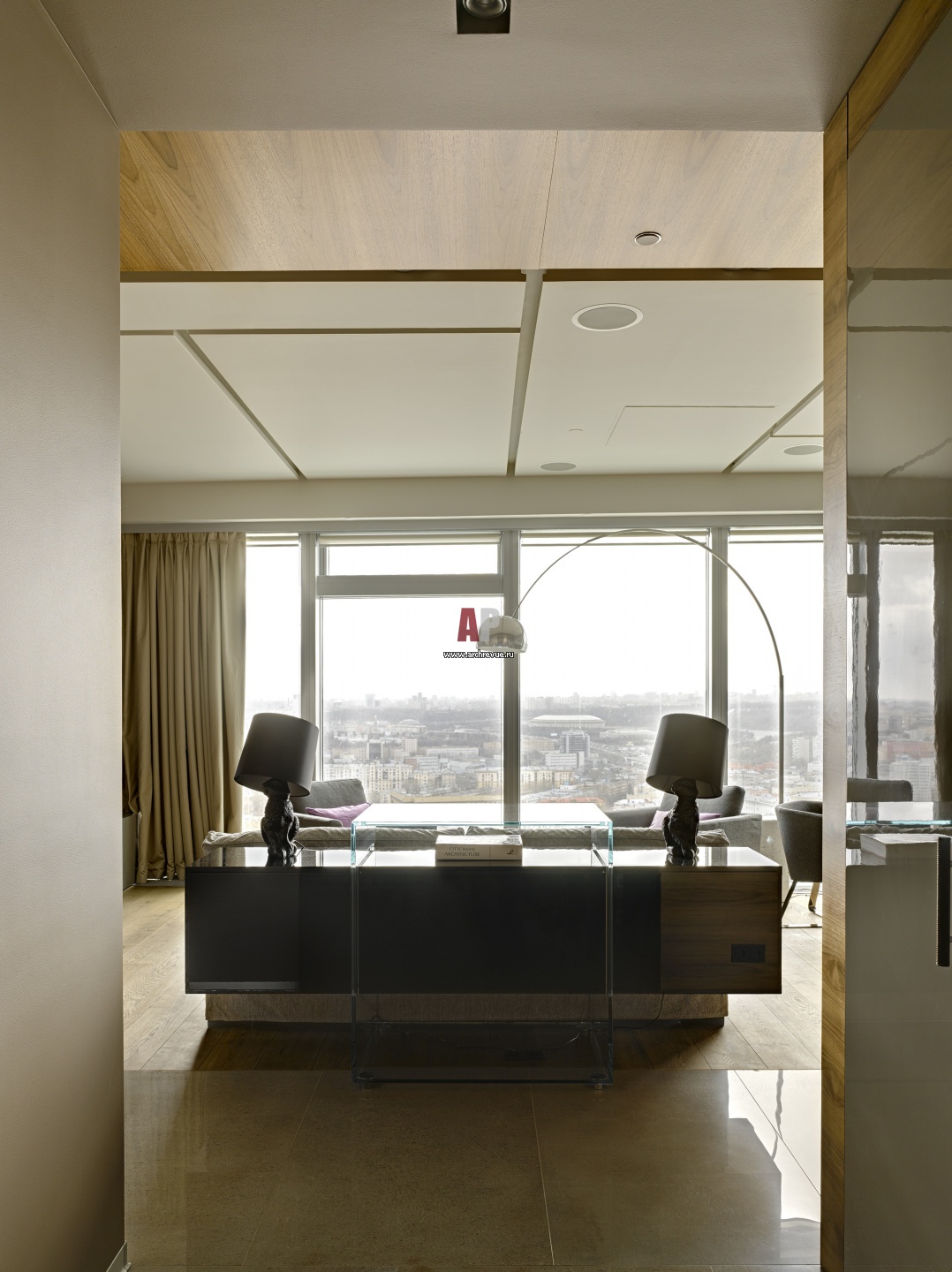 Вид со стороны входной группы на гостиную с панорамным остеклением. Деревянное панелирование, орех. Мебель, Meridiani. Торшер, Flos.